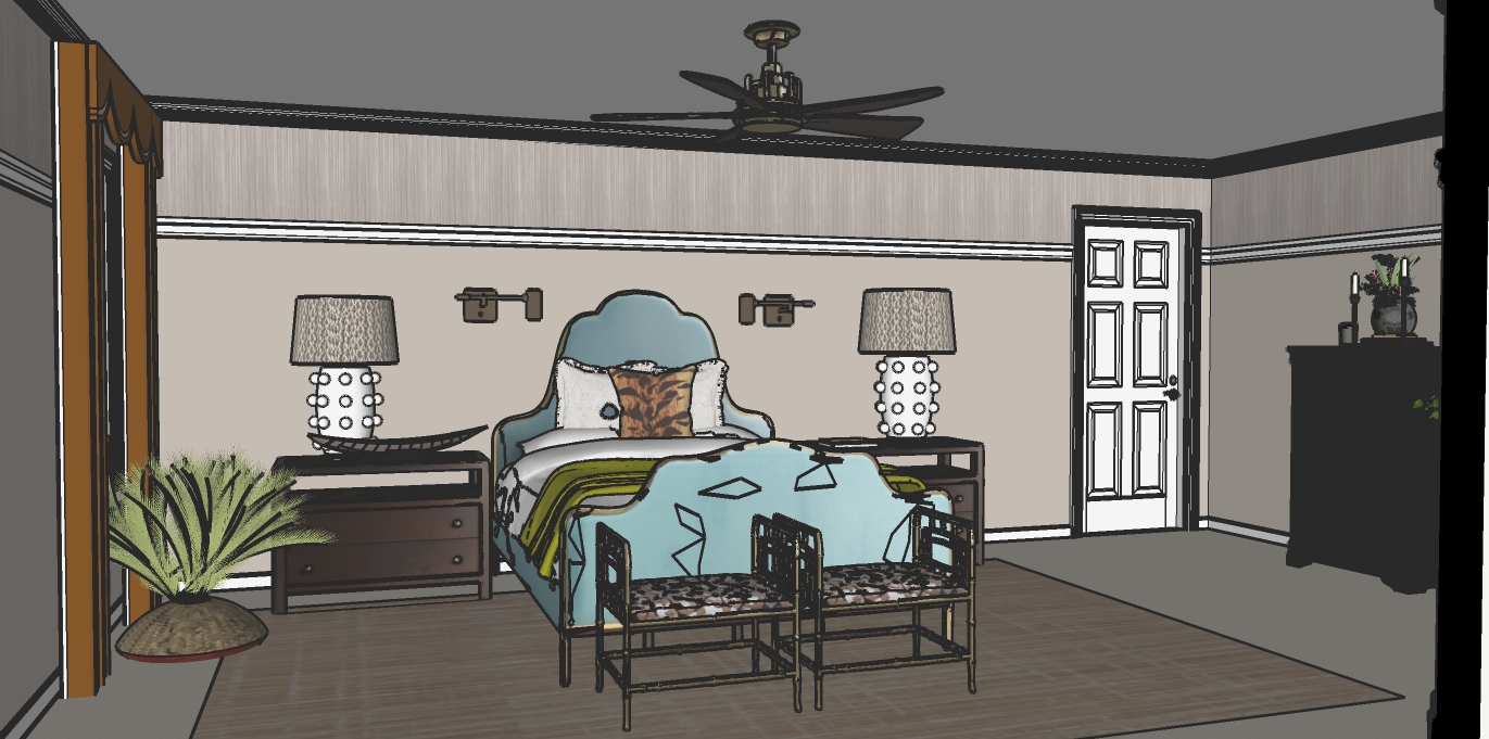 the floor is an off white carpet with a rug the bench at the end of the bed as a gold frame the headboard and the footboard have a gold metal frame around the blue fabric add light coming from the ceiling light and the reading sconces the dresser on the right is black with chrome knobs the drapes are a cognac color the lamp shades have a small pattern on them in and the rug has a faint rust orange pattern on it