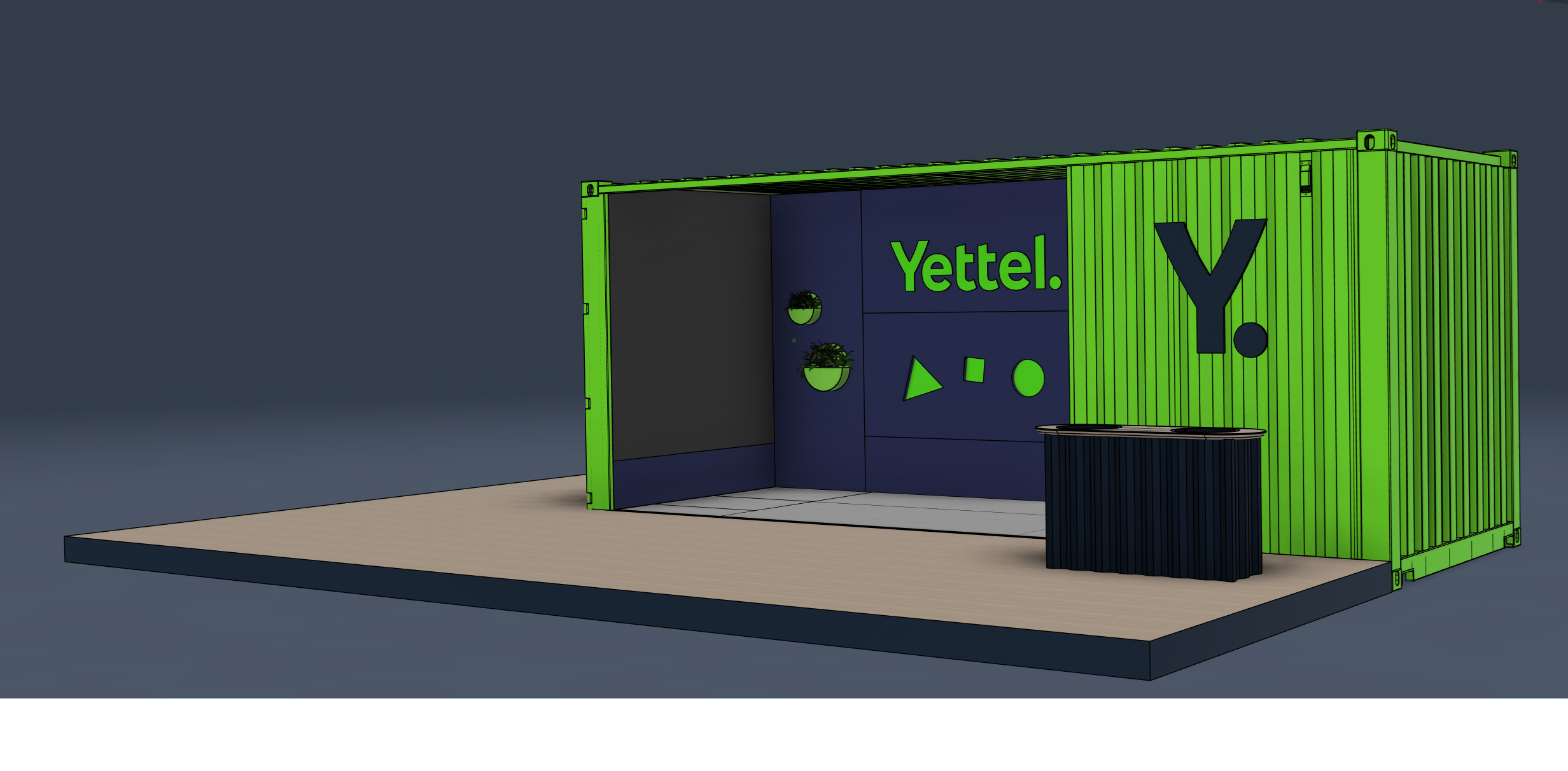 use the attached 3d model as the base structure do not change the architecture of the container transform it into a lively modular event pop up store for the mobile operator yettel located at a summer music festival the container is painted in bright lime green yettel brand color with dark blue interior accents the front facade is fully opened creating an open event activation space inside the container at the center back wall there is a large yettel logo on a dark blue wall in front of it people are taking photos in a photo booth area smiling and posing this creates a social media photo spot atmosphere on the left side where the grey wall area is there is a large led screen in front of the screen a person is wearing vr goggles and interacting with a vr experience the content the person sees is mirrored live on the led screen so other visitors can watch the experience on the right side there is a bar counter made from corrugated shipping container metal matching the container design the bar has a light wood countertop with two circular ice containers one container holds bottles of water the other holds colorful popsicles in clear plastic wrappers the bar is serving visitors during the event in front of the container there is a large wooden terrace made of natural wooden planks on the terrace there are skye blue deck chairs several people are relaxing and chatting creating a friendly festival vibe one person is holding a popsicle while talking with friends the environment is a summer festival setting with people walking around warm sunlight subtle festival elements like banners lights and relaxed social atmosphere the scene should feel like a modern interactive brand activation space combining photo booth vr experience refreshment bar relax seating area social gathering space style highly realistic architectural visualization event atmosphere natural lighting cinematic composition detailed materials vibrant festival mood bar on the right side is navy blue and there is a bartender