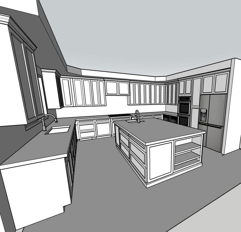 convert this sketchup kitchen model into a photorealistic interior render while preserving the exact cabinet layout and geometry apply chestnut stained maple cabinets with a rich natural wood grain add polished dark granite countertops and a full granite backsplash include stainless steel appliances with a modern brushed finish walls should be clean white painted drywall flooring should be warm oak hardwood planks with subtle grain variation add a finished ceiling with recessed can lighting evenly spaced across the room casting soft warm interior lighting use realistic daylight entering the space to create natural shadows and reflections high end residential kitchen photography style ultra realistic materials global illumination soft shadows detailed textures