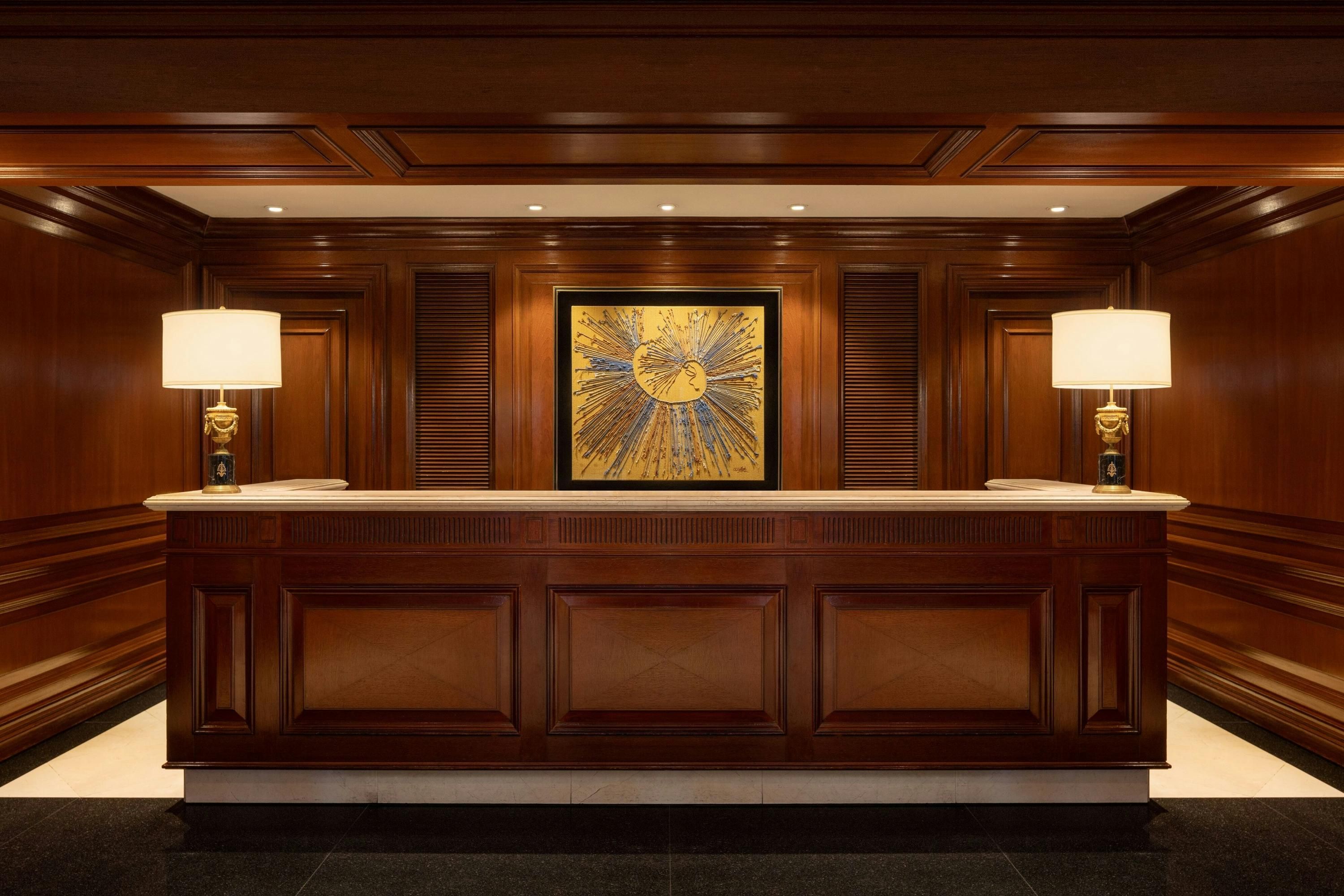 dark green glazed tiles on front desk encaustic white plaster back wall