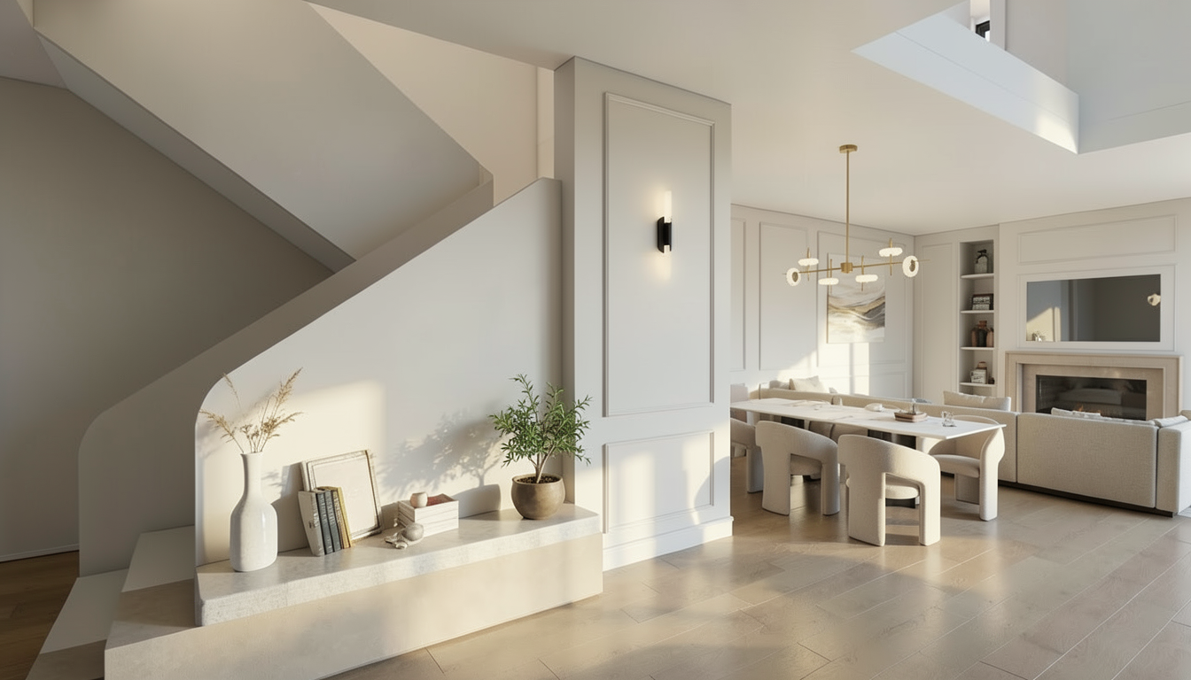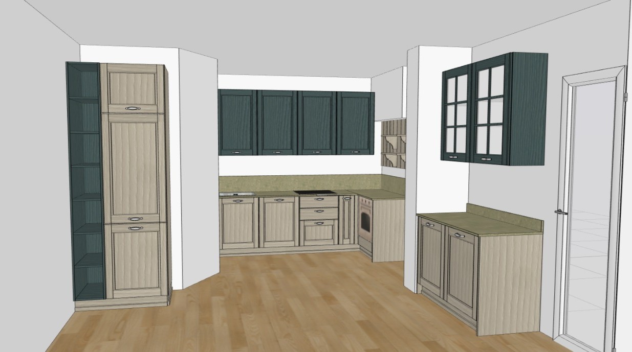 ultra photorealistic render of the exact kitchen from the reference image keep the exact layout and geometry of the design do not modify cabinets shelves or architectural elements preserve the exact original materials and colors from the reference image the wall cabinets and the open shelving column on the far left must clearly show a deep dark green matte finish forest green deep olive green not black balanced interior photography lighting that preserves the real color tones of the materials natural daylight entering from the glass door on the right with a soft outdoor landscape visible soft indirect light coming from the area between the oven base cabinet and the tall column without adding any visible window use balanced exposure so that the dark green cabinets remain visible and detailed with realistic shadows and highlights high dynamic range interior lighting global illumination ray tracing realistic reflections professional architectural photography 35mm lens ultra sharp details photorealistic materials 8k render