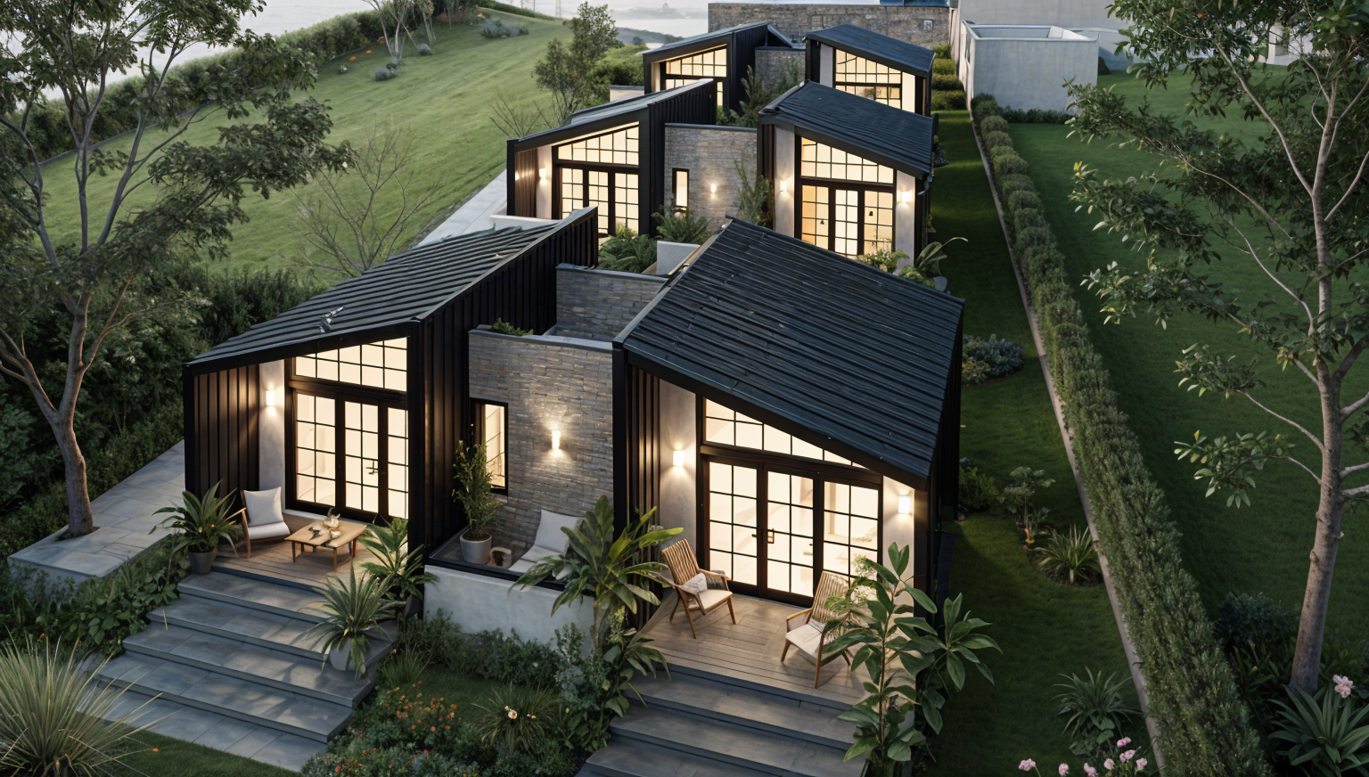 trees behind concrete drive by garage green lawn in front of house landscaping in front of house strips in lawn