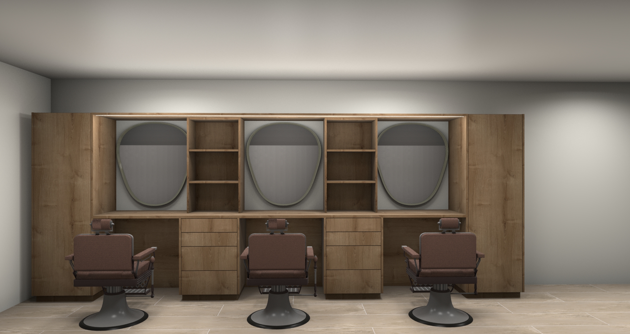 stay true to the original design make the lighting realistic both the incidence and its intensity make the details lifelike refine the details and the lighting elements represent the devices throughout the drawing as realistically as possible render everything in the highest quality make it sharp keep the colors as the input shows its for a barbershop