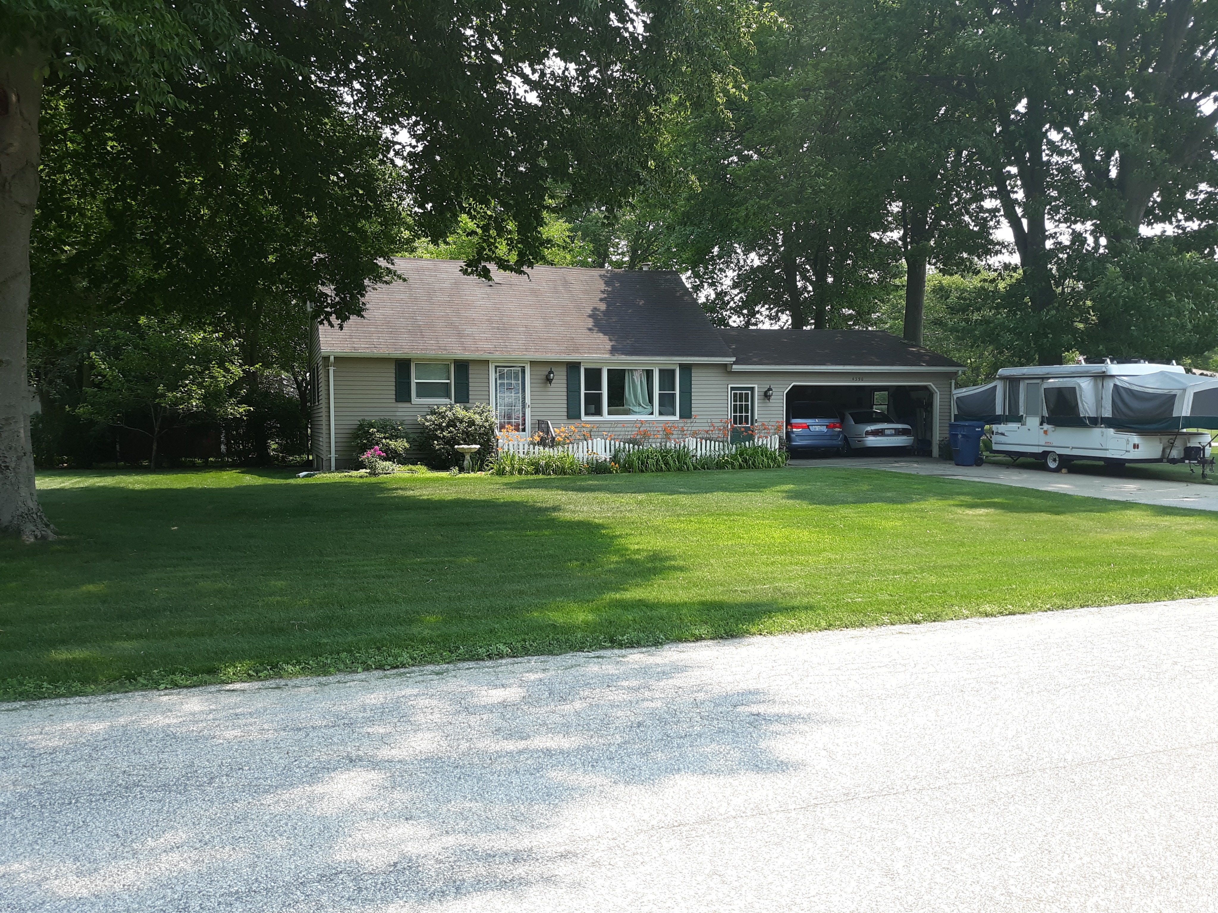 change the color of this house to white with black shutters add a large front porch with gable roof