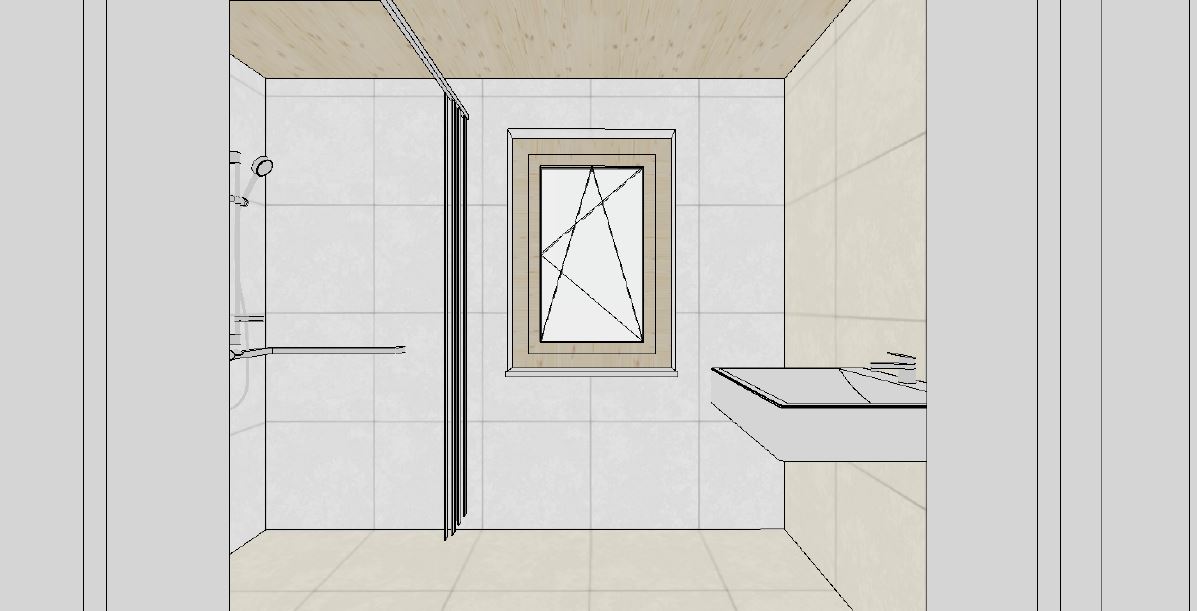 modern minimalist barrier freebathroom featuring white marble tiles on walls and floor a slightly open curtain shower enclosure and a contemporary sink above the sink should be a small mirror cabinet the wooden ceiling a light spruce tone adds warmth to the space a large window framed with polished spruce wood lets in soft natural light creating a serene and airy atmosphere