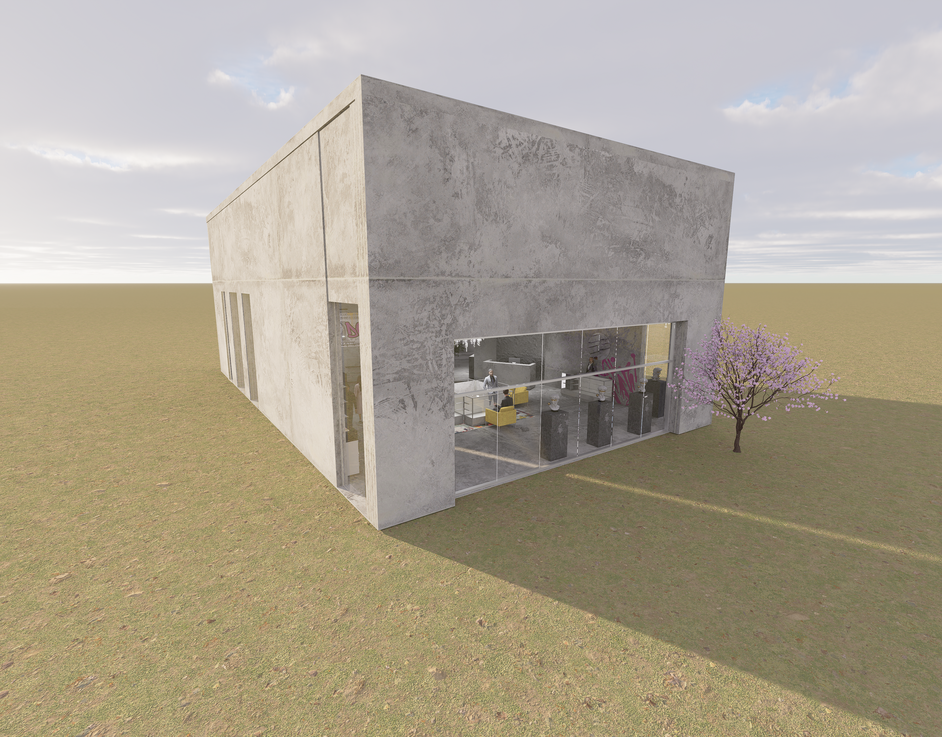 sun hitting front town roads and buildings and trees parking lot to the right of the building