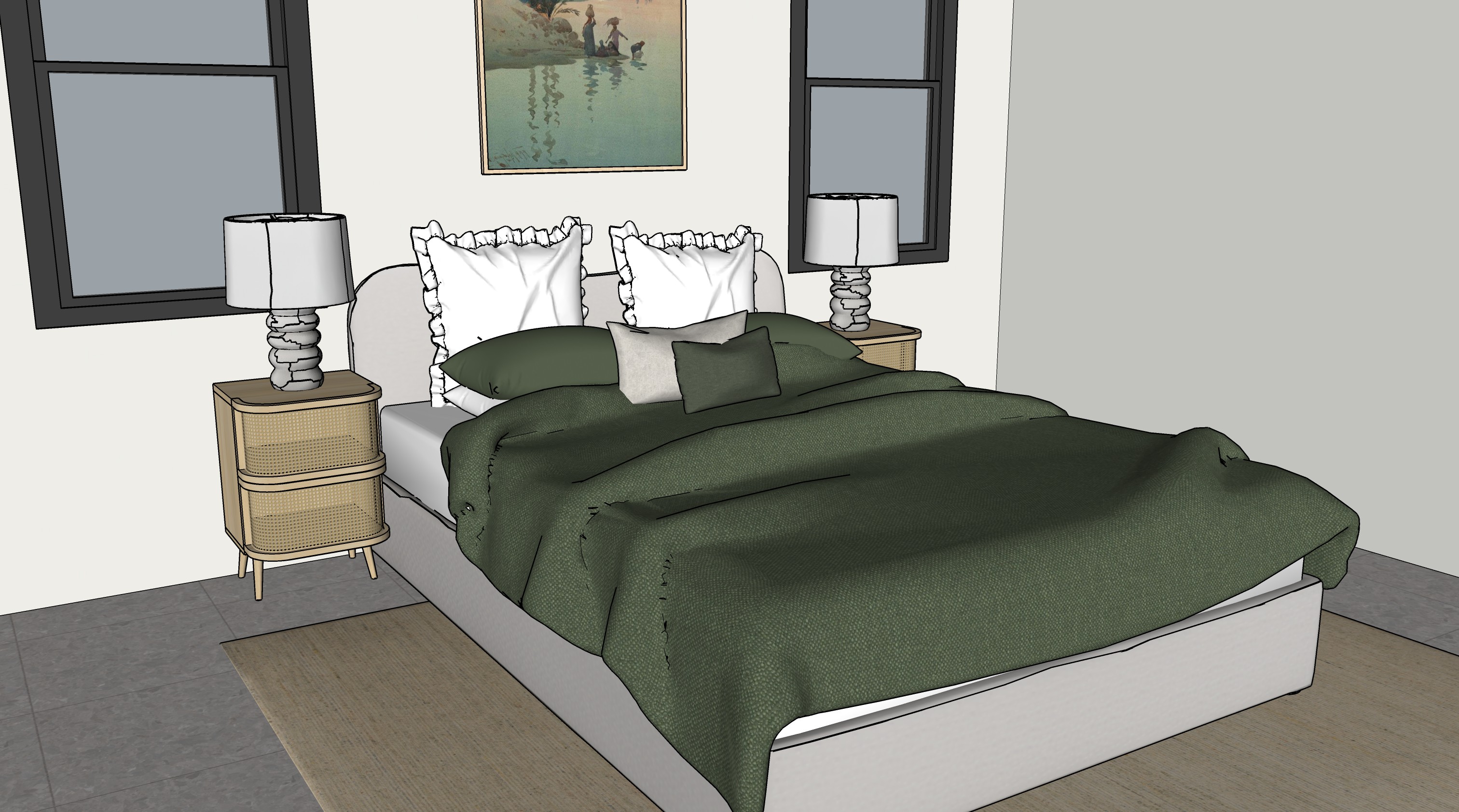flooring is light grey tiles and rug is jute material