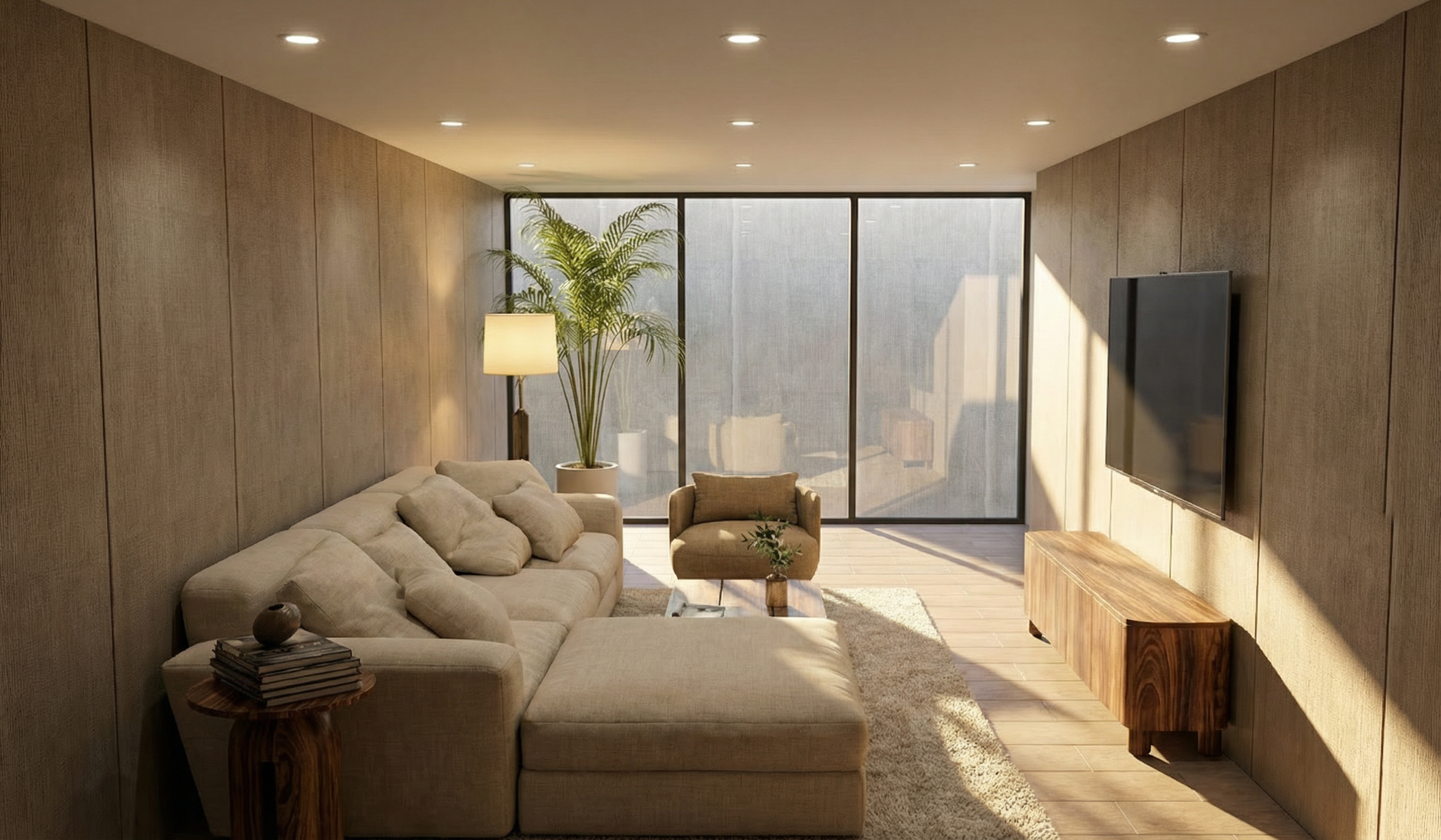 mejorar iluminaci n que haya sombras de luz natural entrando a la escena sillon en lino color beige armchair en color tost do en lino todas las paredes tienen wallpaper de elites rayado elitis volver vp 920 02 hacer mas clara con iluminaci n de un d a soleado hacer vista de la ventana a un jard n con arboles