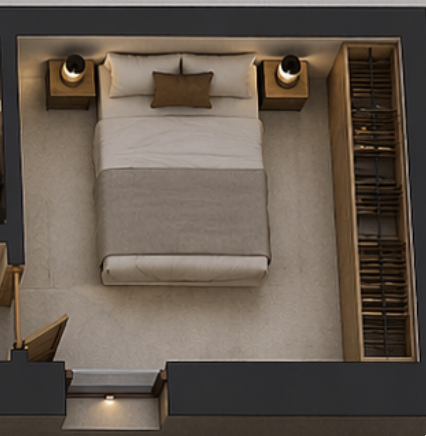 transform this top down bedroom layout into a hyper realistic interior photograph taken from a human eye level perspective standing in the doorway the camera is positioned at the entrance looking straight into the room maintain the exact layout a double bed centered against the far wall two bedside tables with lamps on each side and a full height wardrobe with slatted wooden doors along the right wall keep the window position consistent on the far wall allowing soft natural daylight to enter use realistic proportions and spacing exactly as in the plan style modern minimalist warm neutral tones beige walls light textured flooring natural wood furniture lighting soft natural daylight from the window combined with subtle warm artificial light from bedside lamps realistic shadows and reflections materials highly detailed fabric bedding slightly wrinkled duvet wood grain visible on furniture matte walls soft rug texture camera 35mm lens eye level 1 6m height slight depth of field physically accurate perspective ultra photorealistic high dynamic range global illumination ray traced lighting cinematic composition 8k detail strictly respect the original layout and object placement from the reference image do not rearrange furniture