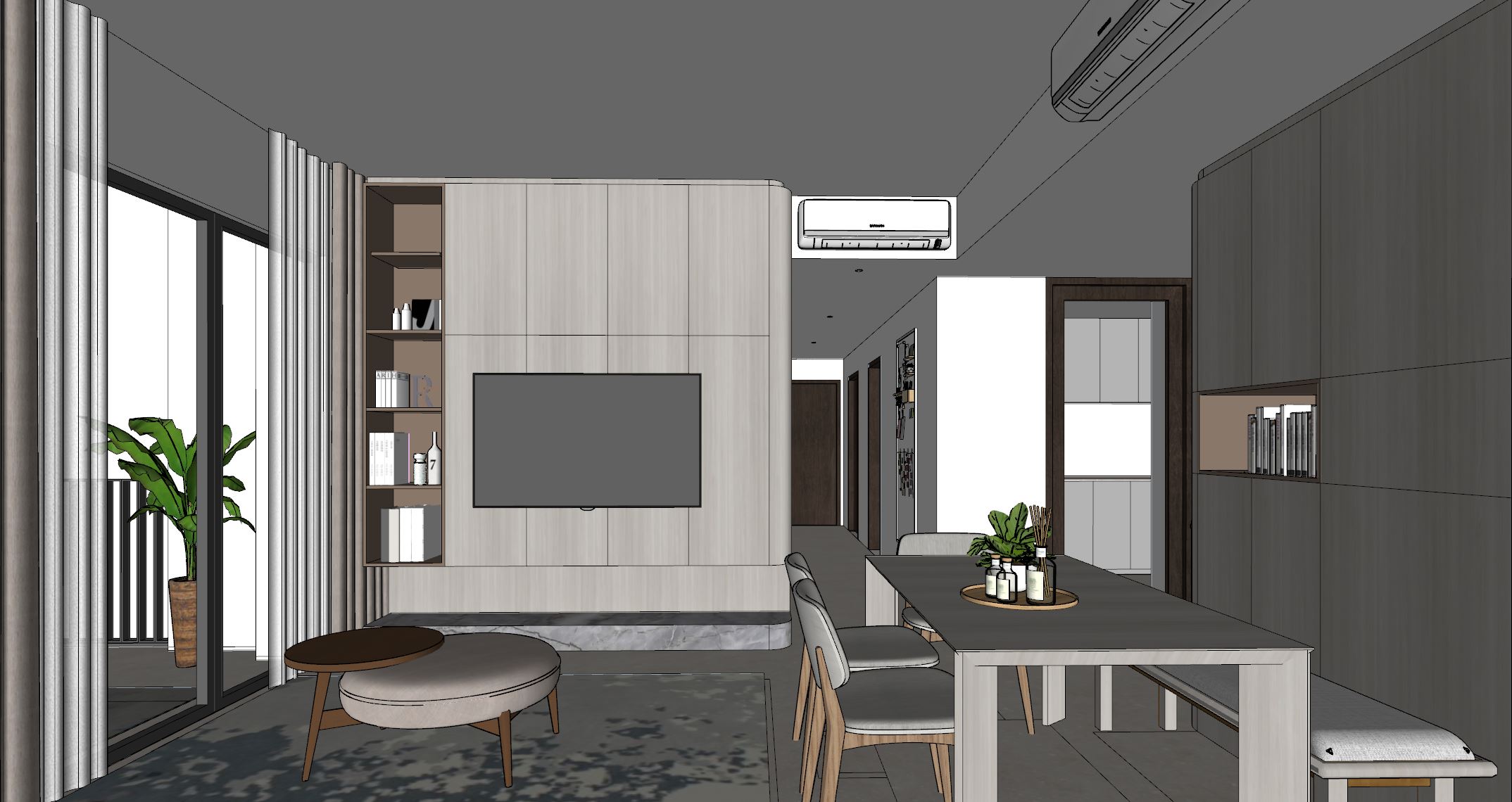 modernist exterior shot the original image is the authoritative reference follow the drawing exactly preserve all wall positions and room proportions exactly no redesign no change of camera angle no layout modification no change on all geometry realistic materials soft global illumination warm ambient lighting led strip accent lighting sunlight entering from windows realistic shadows ambient occlusion highly detailed furniture clean architectural visualization ultra sharp render minimal background high contrast lighting dramatic shadows ray traced lighting photorealistic rendering ultra detailed textures architecture