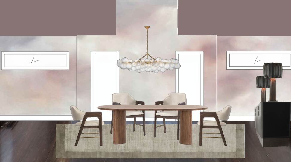 render this dining room with three walls the center wall has a soffit that goes up to a skylight apply to the ceiling the paint color from this source https www benjaminmoore com en us paint colors color 2113 40 cinnamon slate apply the wallpaper from this source https bradleyusa com products cielo etereo wallcovering pos 1 sid ad839c5cb ss r