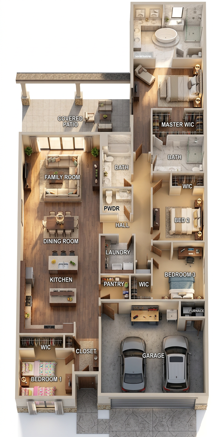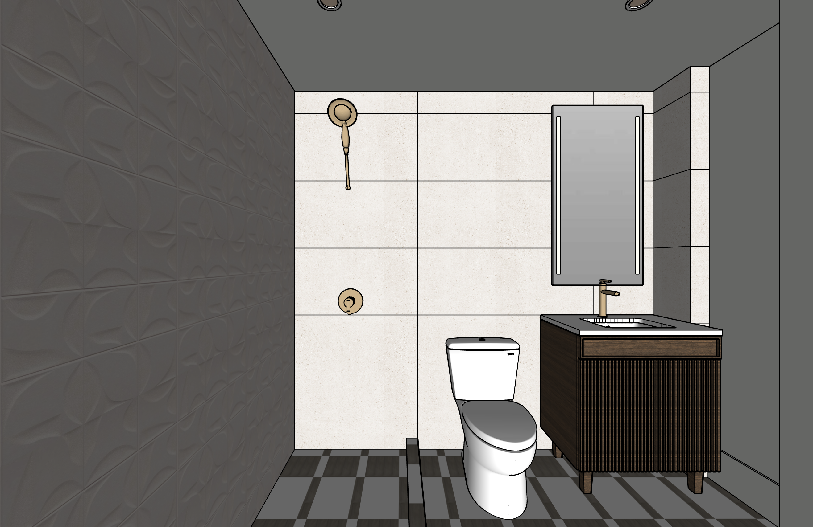 photorealistic enhancement of the provided architectural render preserve the exact architecture layout materials furniture placement and fixtures from the original image with no redesign or modifications the purpose is only to improve realism and lighting quality apply physically accurate global illumination and natural light behavior lighting should feel balanced and natural as in professional interior architectural photography soft indirect daylight fills the space with gentle light bounce from surrounding surfaces shadows are soft subtle and physically realistic with natural falloff all materials remain unchanged but respond to light more realistically stone surfaces with natural micro texture wood grain with depth matte flat painted walls with soft diffusion and brushed metal fixtures with correct reflections no surfaces emit light unless they are actual light fixtures plumbing fixtures such as shower heads and faucets must remain non emissive and only reflect ambient light metallic fixtures reflect light but never emit light the finishes should never have altered color or patterns render as high end interior photography using a full frame camera with a 24 35mm architectural lens balanced exposure realistic dynamic range subtle depth of field and natural color grading the image should look like a professionally photographed luxury interior rather than a computer render the scene should be bright but without unrealistic or unnecessary shows do not change architecture do not change materials no redesign no new objects no additional lights no glowing fixtures no light from shower heads or faucets no dramatic shadows no surreal lighting no warped geometry no stylization the plumbing fixtures and bathroom faucet should all be brushed brass the can lights in the ceiling should be emitting light and brightening the space the tile color and overall nature should not be altered the back wall tile should be white matte with subtle limestone texture the floor tile pattern should not change the led mirror should be turned on and shining light through the two light strips lastly the reflection in the mirror should show a solid white wall remove the gold shower drain and lighten the tile on the side of the wall itt should be closer to white and cream colors