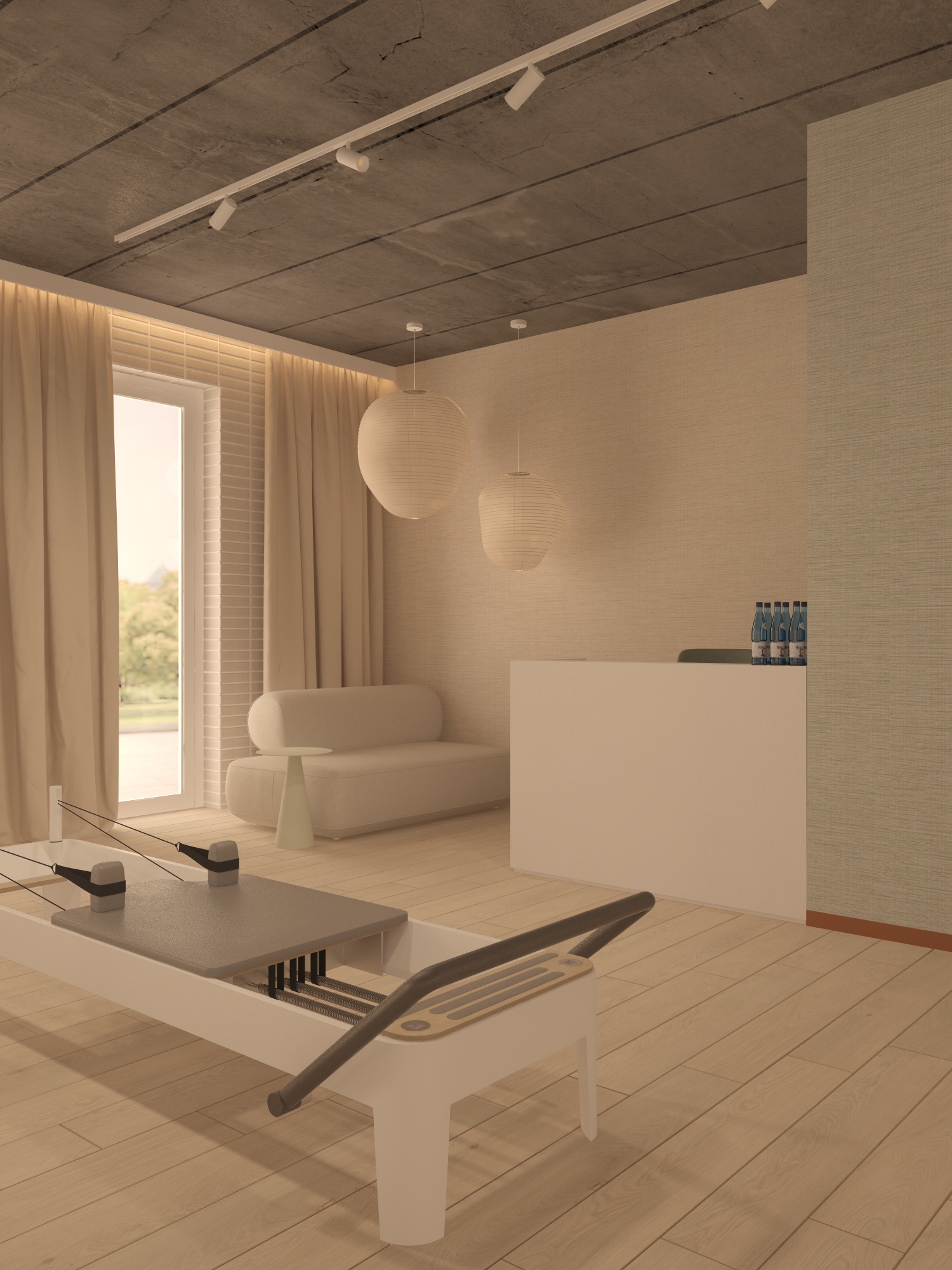 transform this image into a high end photorealistic architectural render add a little natural sunlight entering from the window on the left side creating soft shadows and realistic light bounce but keep the whole image light and without much contrast enhance material detail realistic reflections global illumination and natural color balance keep the original geometry and camera angle unchanged