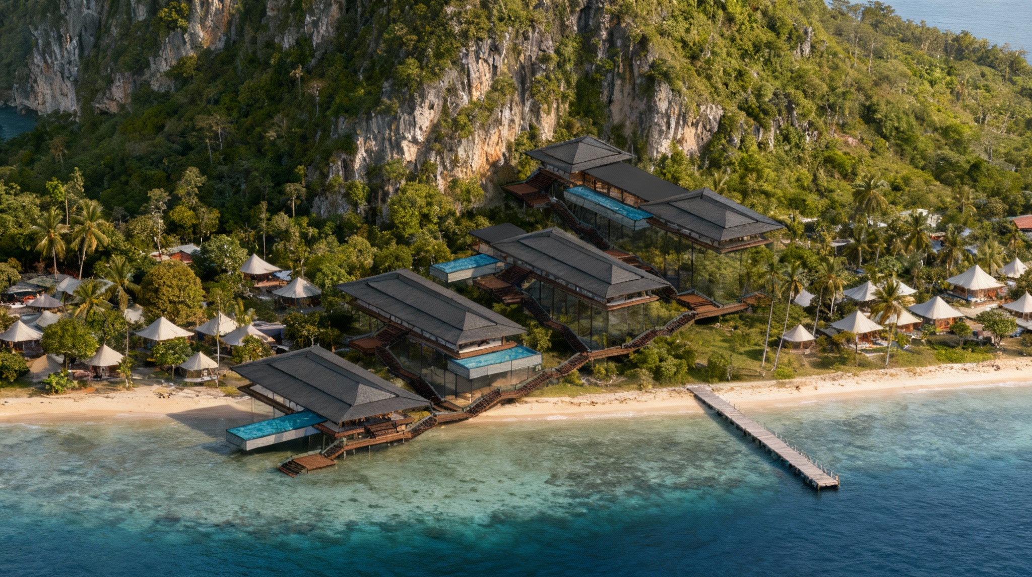 render the existing 3d drawing from an aerial angle looking slightly downward at the villa do not change any elements of the model only adjust the angle enhance the luxury japanese style architecture with wood columns dark roof and minimalist modern expression show the villa elevated on stilts floating above the coastal hillside dry forest preserve the ambience sea visible far back small road and pedestrian zone in the lower foreground and dense tropical vegetation on the upper hill behind