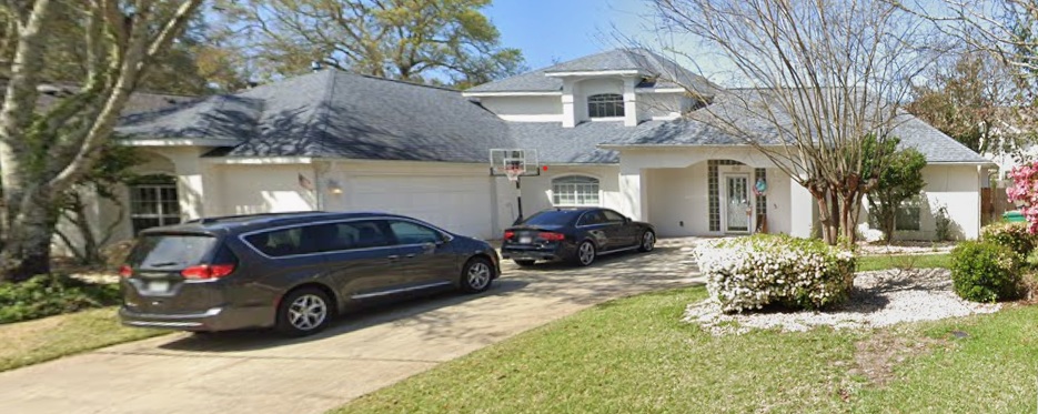 please create a clean architectural rendering of the front elevation of the house shown in the reference photo remove all vehicles trees and other foreground obstructions to present an unobstructed view of the home retain the house s existing architectural features such as the white stucco walls gray hip and gable roof and the central entry with its overhang use natural even daylight lighting to keep everything clear the final image should be a neat distraction free view of the home s front fa ade suitable for design review and further styling