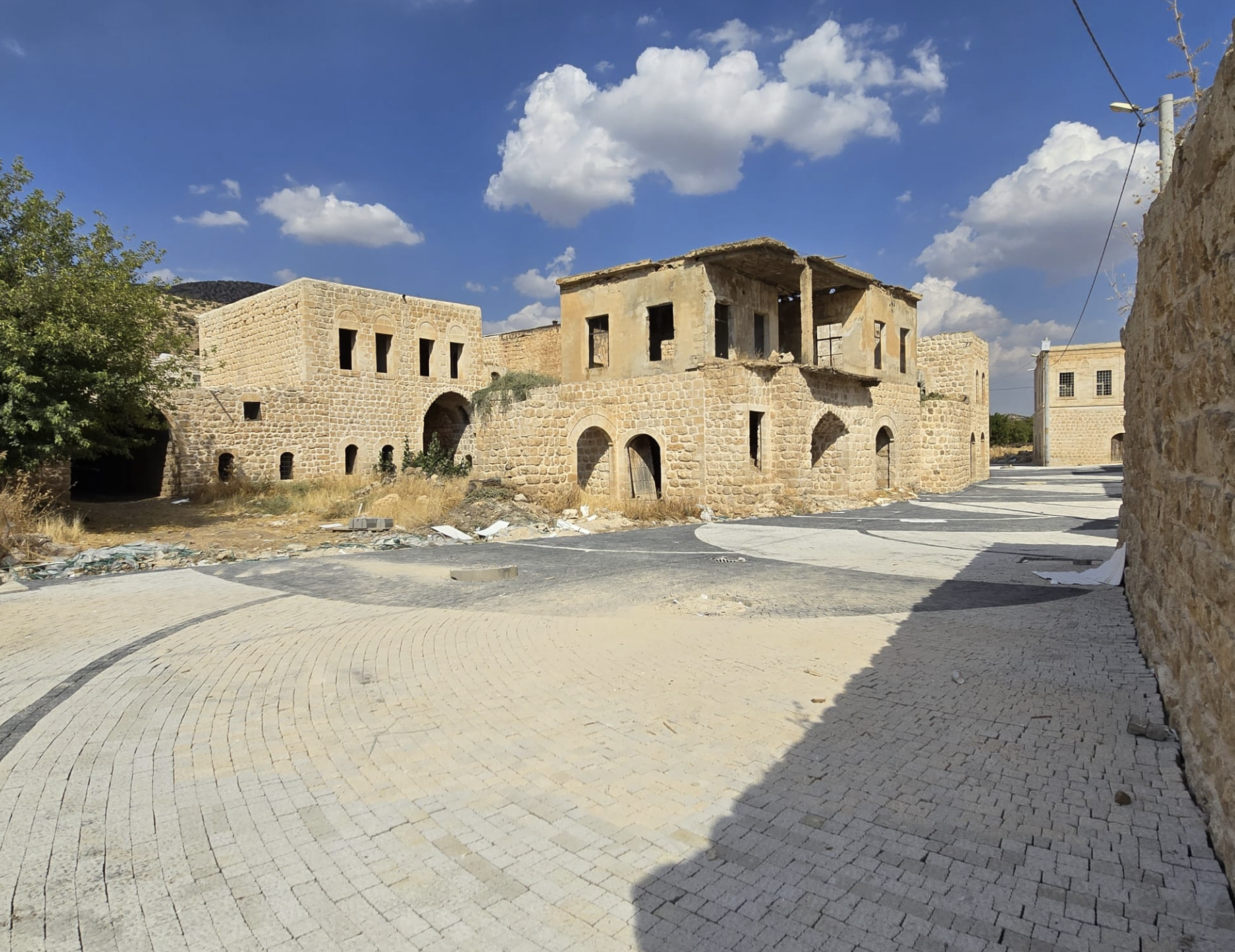 new urbanism exterior shot evening light old ruin city turistic info and benches on grass corten steel bars sustainable corten steel and wooden benches architecture