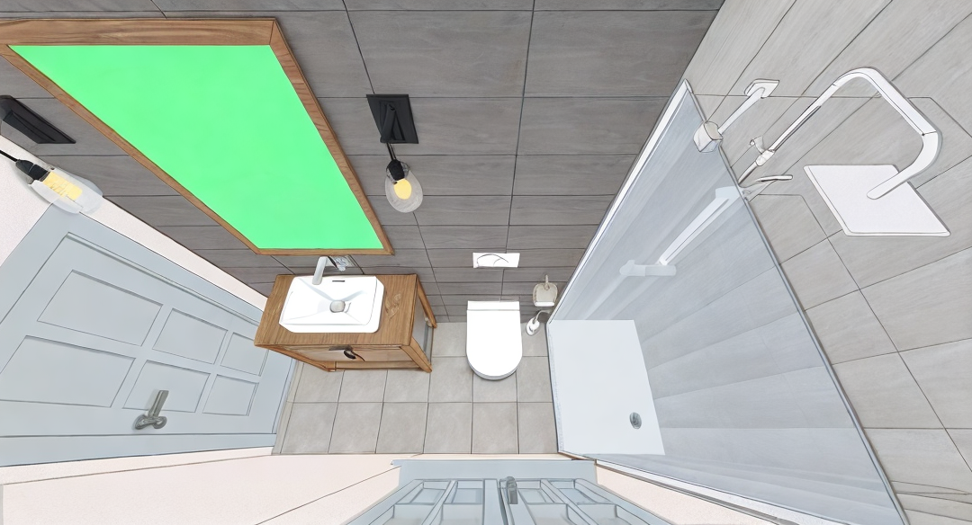 interior from the top a cozy elegant modern bathroom with soft natural lighting the walls are tiled with sleek dark gray tiles and the floor is laid with smooth matching light gray tiles a rustic wooden vanity with a warm oak finish complements a rectangular mirror bordered with similar wood the door is painted a gentle pastel blue adding a subtle pop of color a minimalist silver showerhead in the corner enhances the modern aesthetic small wall mounted lamps in matte black provide a warm glow casting soft yellow light the atmosphere is serene and sophisticated blending modern minimalism with warm inviting tones architecture