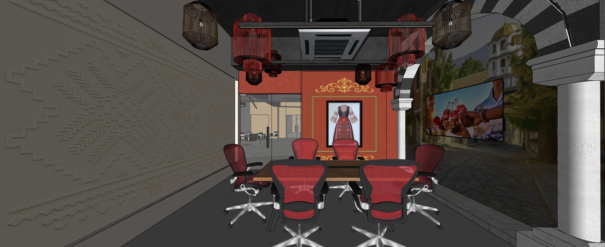 a modern conference room inspired by the themes of bulgaria to the left wall an embossed artwork on the wall made of skimcoat and paint iluminated by cove light from the top and bottom the wall at the middle is made decorative red paint with gold european style moldings and a bulgarian dress in a picture frame to the right is a mock up of a bulgarian arch from rila monastery the ceiling has wood chandelier pendant lights in red and brown paint the chairs have red mesh and black frames with the flooring made of gray carpet