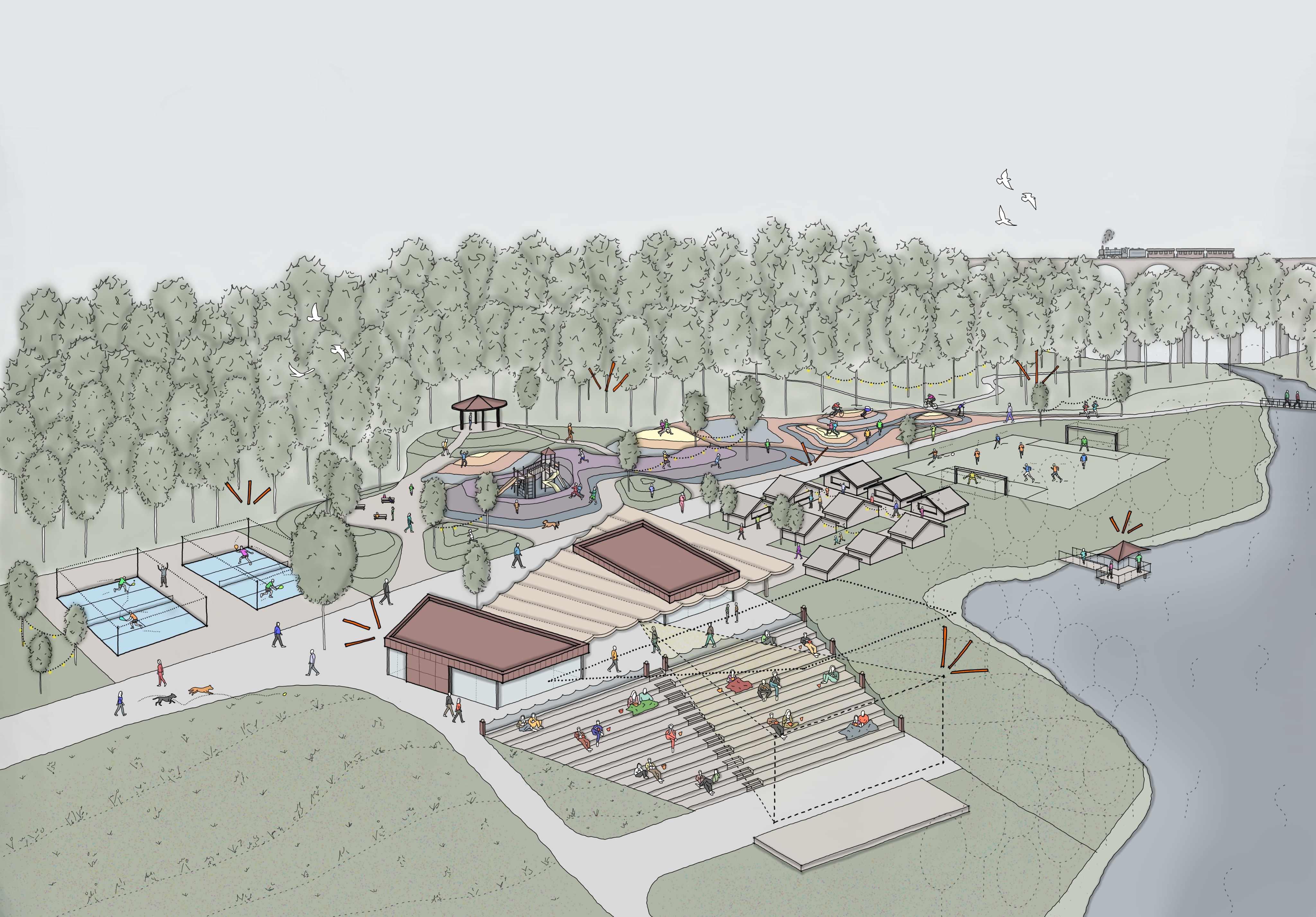 cinematic evening aerial view of a lively riverside park surrounded by dense woodland modern community pavilion with deep red and cream cladding amphitheatre steps filled with people watching an outdoor cinema screen warm ambient lighting and festoon lights from festive market stalls families walking through landscaped park paths padel courts and football pitch active with players children play area and skate park soft glowing lights reflecting from the river atmospheric dusk sky photorealistic architectural visualization ultra detailed vegetation and realistic people
