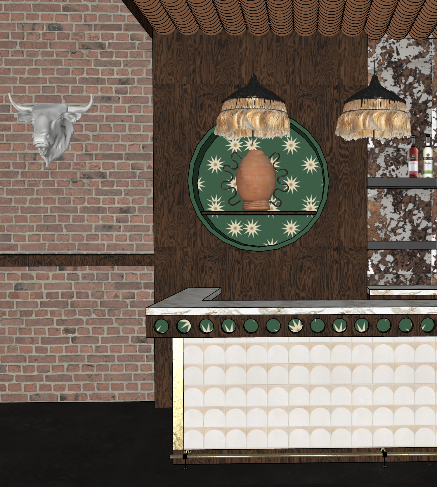 ultra photorealistic architectural interior photography of a spanish inspired cocktail bar backbar vignette warm hospitality atmosphere highly detailed materials cinematic lighting and luxury restaurant realism feature wall clad in rich dark walnut wood veneer panels with dramatic natural grain variation deep tone shifts and satin finish showing authentic wood pores and subtle imperfections centered within the wall is a recessed circular niche painted in deep spanish green with hand painted starburst motif matte mineral paint texture and subtle tonal variation inside the niche sits a handcrafted terracotta clay vessel with natural surface irregularities mineral variation matte ceramic texture and realistic artisanal imperfections shelf is dark wood with visible grain and slight edge wear above the niche hang woven spanish style fringe pendant lights with black woven tops and layered natural fiber fringe shades fibers show realistic fraying softness and irregularity lighting emits warm 2700k glow with soft diffusion and realistic falloff onto surrounding wood and objects bar front clad in handcrafted ceramic tile in warm cream tone with scalloped relief pattern tiles show realistic glaze variation slight edge irregularities subtle reflectivity and authentic grout joints bar rail trim in dark stained wood with inset glossy deep green ceramic round accent tiles showing specular highlights and handmade variation bar countertop is honed natural stone with realistic mineral veining soft reflectivity and matte finish brass foot rail at base with authentic brushed brass finish micro scratches natural patina and realistic metallic reflections adjacent wall constructed of exposed clay brick with natural color variation porous texture mortar joints and subtle imperfections mounted on brick wall is sculptural bull head in plaster or cast stone with matte surface texture and soft shadow casting floor is dark polished concrete with subtle reflectivity tonal variation and realistic wear lighting is warm intimate hospitality lighting at 2700k with realistic global illumination soft shadows bounce lighting and cinematic depth accurate reflections contact shadows and ambient occlusion camera perspective is professional architectural interior photography straight on composition eye level view 35mm lens sharp focus balanced exposure shallow depth of field falloff material realism is critical no stylization no illustration no cgi look no artificial surfaces all materials must show authentic depth imperfections and physical realism style reference high end spanish cocktail bar boutique hospitality interior luxury restaurant design architectural digest photography professional commercial interior photography render settings ultra photorealistic ray tracing global illumination physically accurate materials cinematic lighting realistic reflections ambient occlusion micro surface imperfections hdr lighting 8k resolution sharp focus