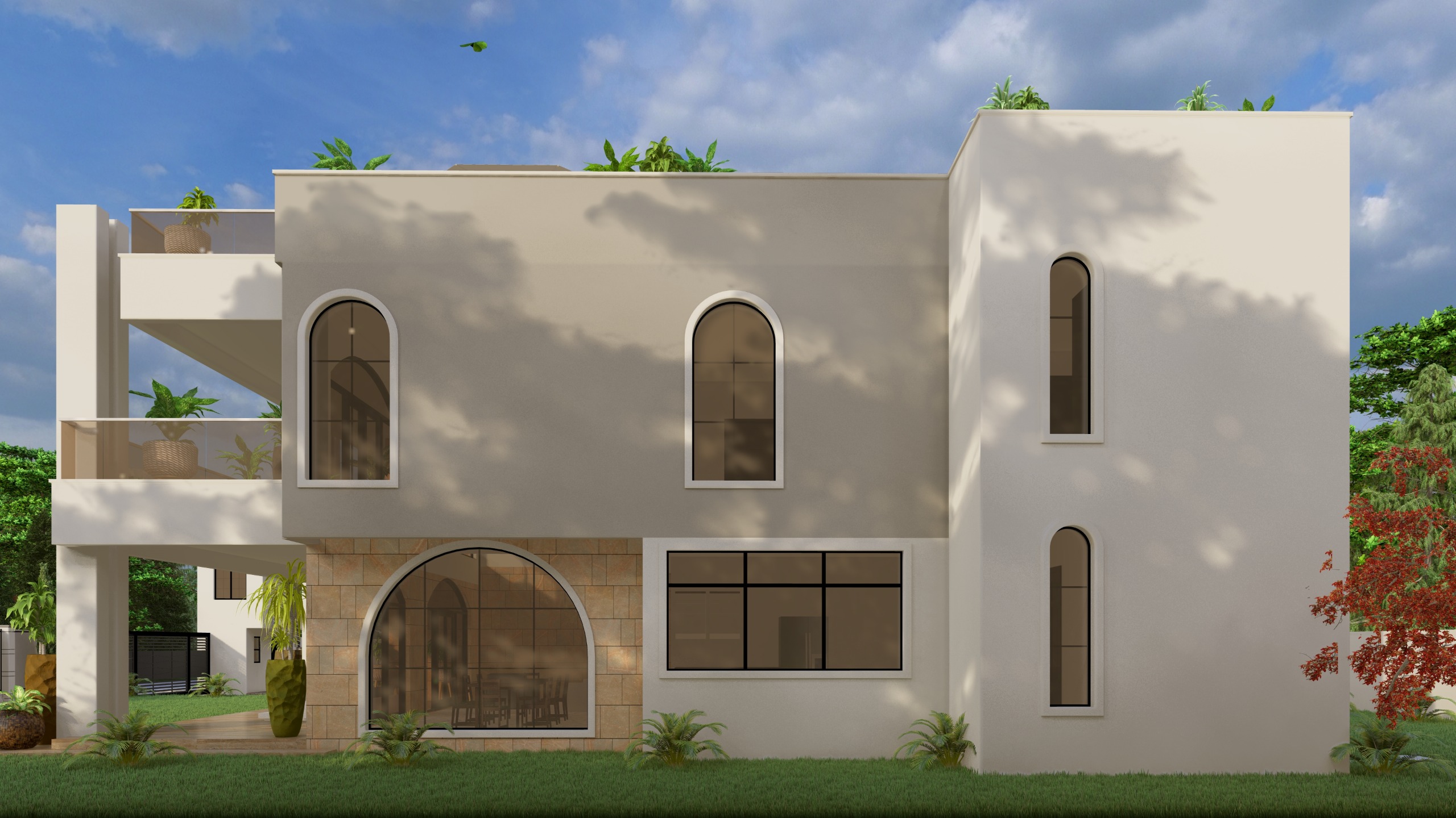modern architectural facade of a house with smooth grey and white walls featuring elegant arched windows with warm room lighting the patio displays potted plants in earthy tones and lush green foliage on the upper terrace with outdoor furniture on it the garden is a rich emerald green with a few flowers on the foreground and distant mature trees in the background the sky is a bright clear blue with soft fluffy clouds creating a serene and harmonious atmosphere natural lighting casts gentle shadows enhancing the architectural details the walls have beautiful sconces distributed randomly