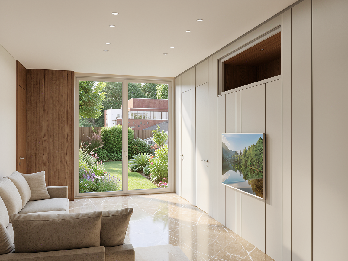 interior luxury master bath with white quarts and a open medicine can niche