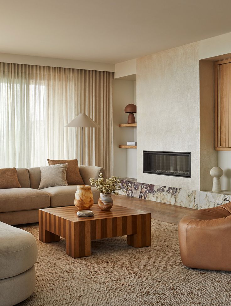 modern minimalist living room with a cozy atmosphere soft beige walls and drapes create a warm inviting ambiance a comfortable cream colored sectional sofa is adorned with light brown and beige cushions a low rectangular wooden coffee table with natural grain patterns is placed in the center the floor is covered with a textured neutral toned rug the fireplace is elegantly integrated into a subtle textured wall surrounded by a marble border with hues of gray and beige simple wooden shelves hold decorative items adding a touch of elegance soft natural lighting streams through sheer curtains casting a serene glow earthy tones and natural materials contribute to the tranquil harmonious setting make a similar immage with different layout change coffe table