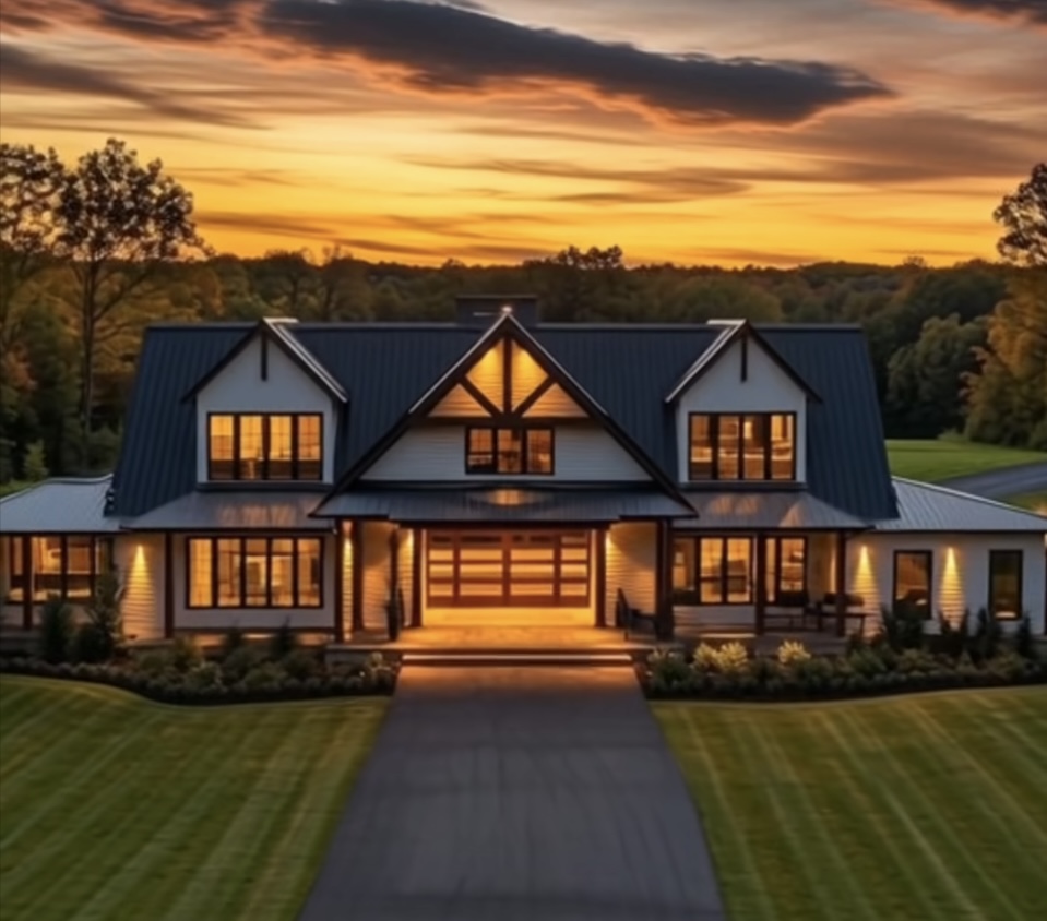 a modern farmhouse at sunset featuring a large two story design with a steep gray metal roof and white siding the windows glow warmly with amber light creating a welcoming atmosphere the sky is a breathtaking gradient of orange pink and purple hues casting a serene and tranquil ambiance surrounding the house are lush green lawns and a few tall trees providing a harmonious blend with nature the driveway leads up to the house reflecting the soft glow of the sunset