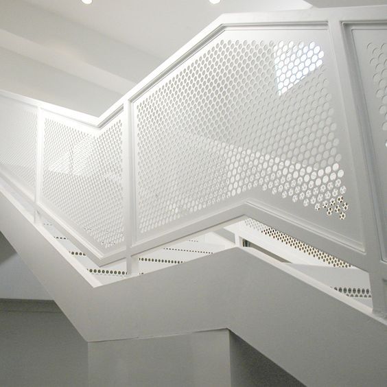change the color of the stairs and railing to black change the design of the perforated metal sheet from circles to ovals
