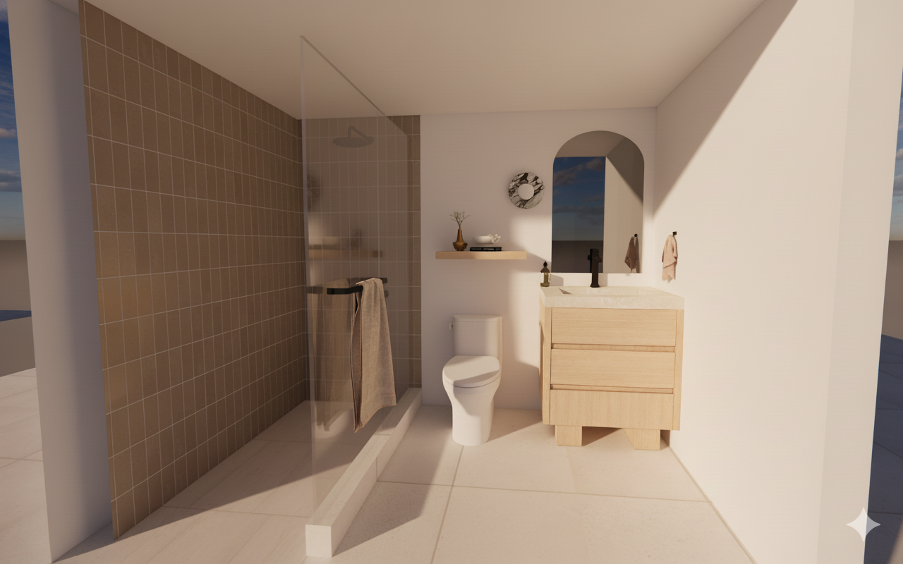 enhance this render to look more realistic improve lighting shadows reflections and material realism but do not add remove or alter any elements objects or materials keep everything exactly the same just make it more photorealistic architecture add recessed can light in the shower and to the white bulb on the wall sconce change reflection on the mirror to a beige wall