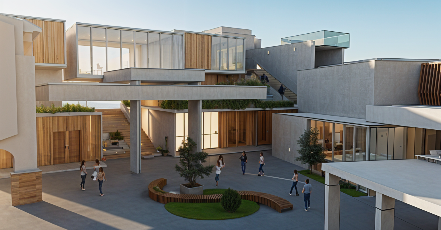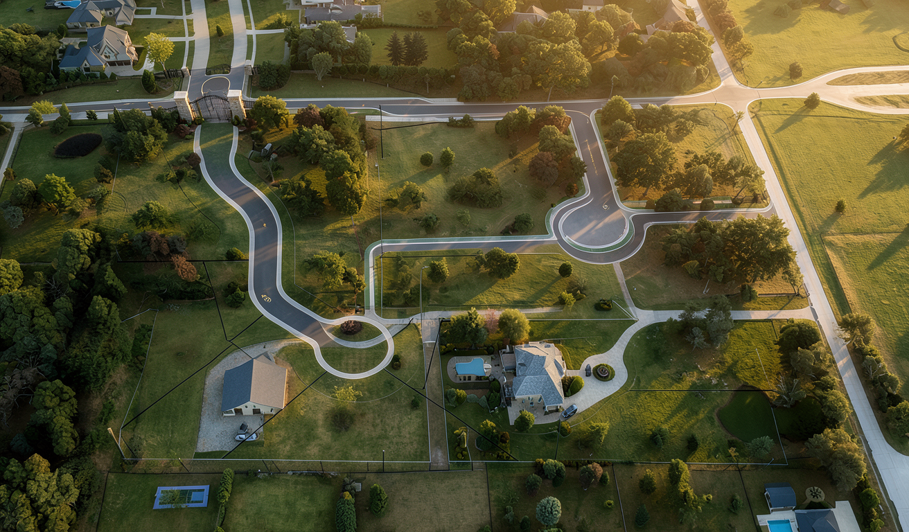 transform this aerial image into a photorealistic luxury residential subdivision critical completely remove the two existing structures shown on the site house and barn including all driveways pads and any associated man made improvements do not blend or partially retain fully erase them and replace with natural terrain replace removed areas with clean grass natural soil and continuous landscape that matches the surrounding environment critical maintain the exact subdivision layout from the overlay do not alter geometry this includes curved private road alignment cul de sac size and shape all 8 lot boundaries and configuration make lot lines bold so they stand out roads should appear newly constructed with smooth asphalt clean concrete edges and realistic width proportions clearly define each lot using subtle mowing lines landscaping edges or natural transitions not artificial survey lines preserve all mature trees across the property only clearing where necessary for roads and home sites maintain a natural estate style setting with large open lawns and clusters of trees add a high end gated entrance at the north west main road with stone columns iron gates and professional landscaping maintain natural topography with gentle slopes do not flatten the site lighting should be warm golden hour with long shadows for depth camera should be a slightly angled aerial view 30 45 degrees not top down showing depth road curvature and lot layout clearly ultra photorealistic highly detailed 8k quality cinematic rendering