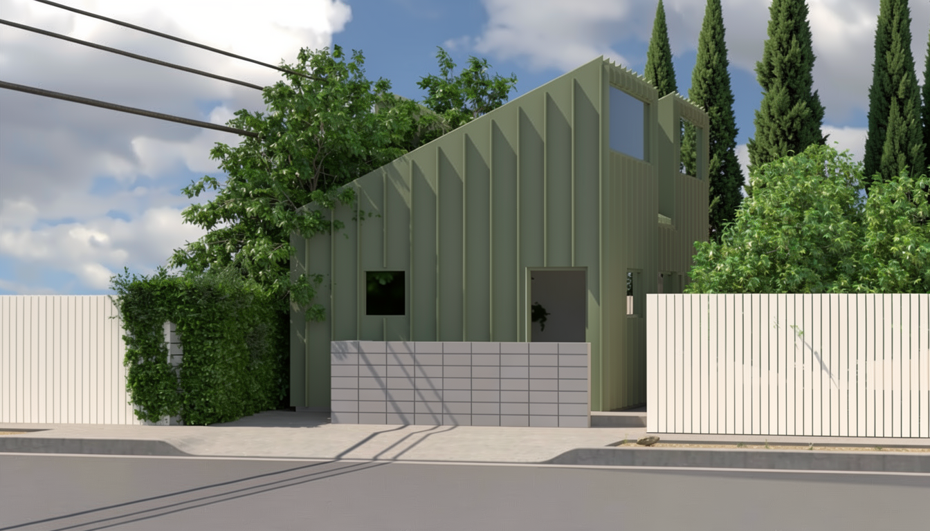 only change the 2 dark green trees on the upper right side make the 2 trees on the upper right side look like realistic cypress trees keep them in the same location behind the existing trees don t generate more than the existing 2 trees add a front door behind the cmu blocks the cmu blocks should cover half of the front door dont change anything else only change what i asked