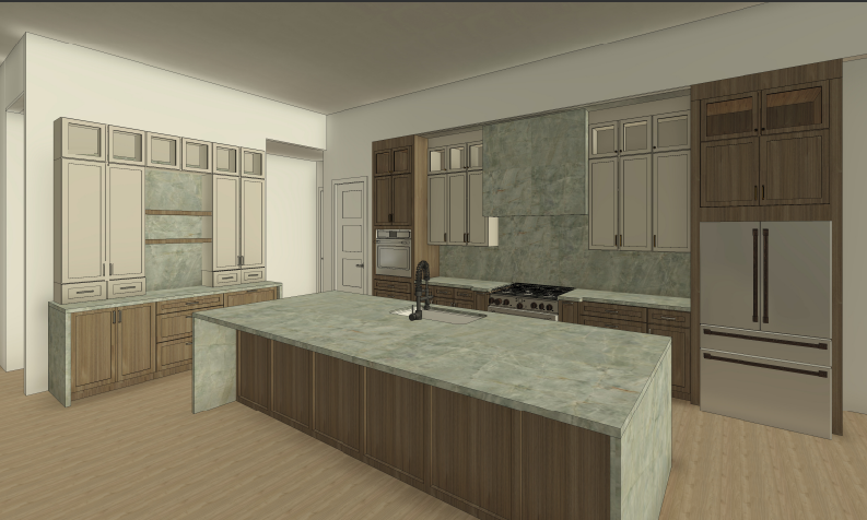 realistic photographic kitchen rendering in natural daylight preserve architectural layout exactly left wall cabinets large built in unit with painted cabinets in soft warm white with a whisper of cream the center section has open wood shelving in neutral walnut taupe oak with green marble behind it flanking painted cabinets include small upper glass front cabinets at the very top right wall cabinets tall pantry towers and cabinets flanking the range in neutral walnut taupe oak with a small hint of warmth straight visible grain not golden small upper glass front cabinets at the very top of the wood towers painted cabinets in soft warm cream sit directly around the hood panel ready refrigerator on the far right in matching walnut taupe oak hood painted in the same soft warm cream as the surrounding painted cabinets island fluted base in neutral walnut taupe oak countertops island top and full backsplash soft muted sage green marble dusty desaturated green grey between seafoam and eucalyptus with cloudy cream and warm grey veining blending organically in the character of verde alpi marble polished continuous across all surfaces glass cabinet interiors only the small upper glass cabinets at the tops of the towers have glass styled with neatly stacked white ceramic plates and simple glassware all other cabinets are solid opaque shaker doors do not add glass anywhere else hardware champagne brushed bronze throughout styling small plant on counter fruit bowl on island one cookbook natural daylight no pendant lighting