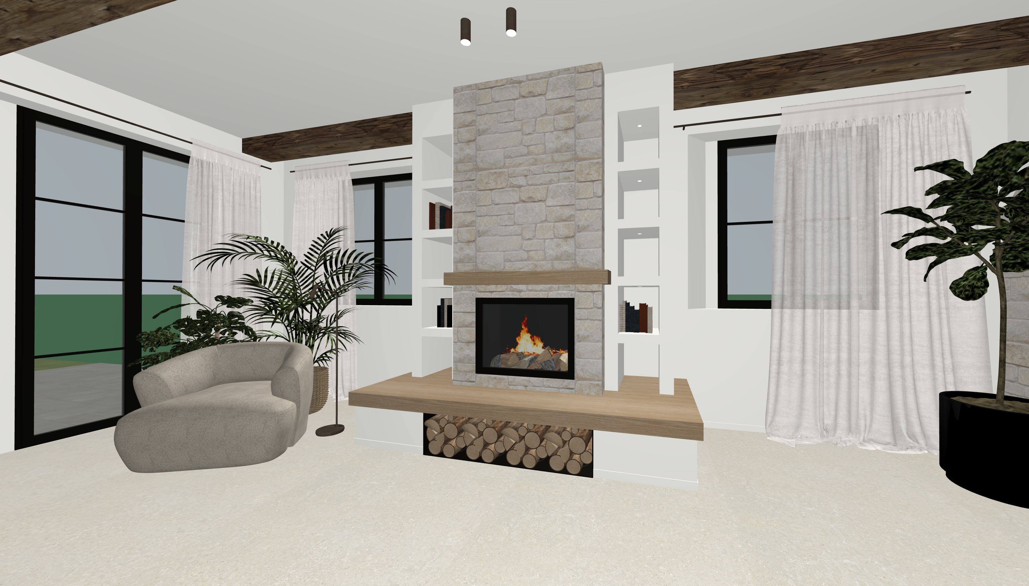 dentro ad ogni nicchia a fianco del caminetto c un faretto punto luce fuori c un panorama di campagna