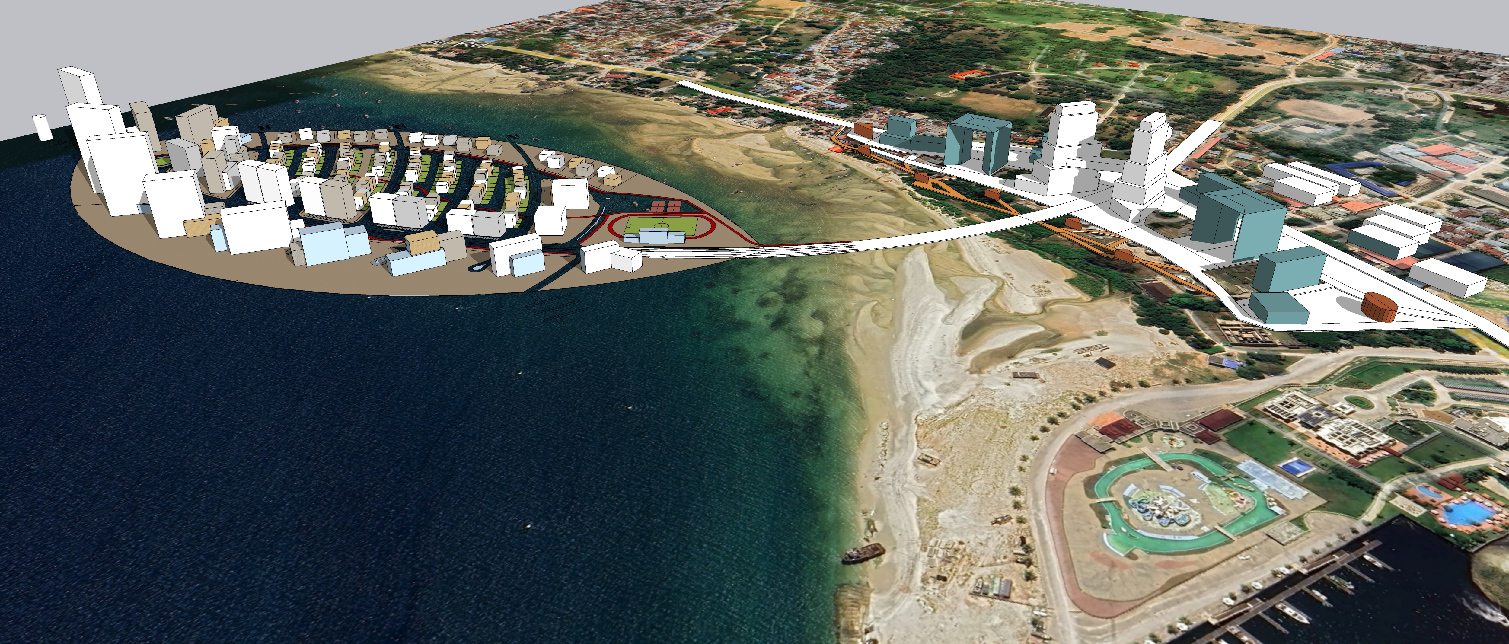cinematic hyper realistic tropical island city and shoreline keep the overall massing and layout but reinterpret it with modern tropical architecture add mixed use housing retail streets and sports facilities integrated into a lush coastal environment with high rise modern hotels and office buildings include dense tropical vegetation palms flowering trees coastal plants and layered greenery add detailed street furniture such as benches shading structures planters bike racks lighting and wayfinding populate the scene with diverse people walking shopping exercising and relaxing use warm natural light soft atmospheric haze and a high end filmic look architecture