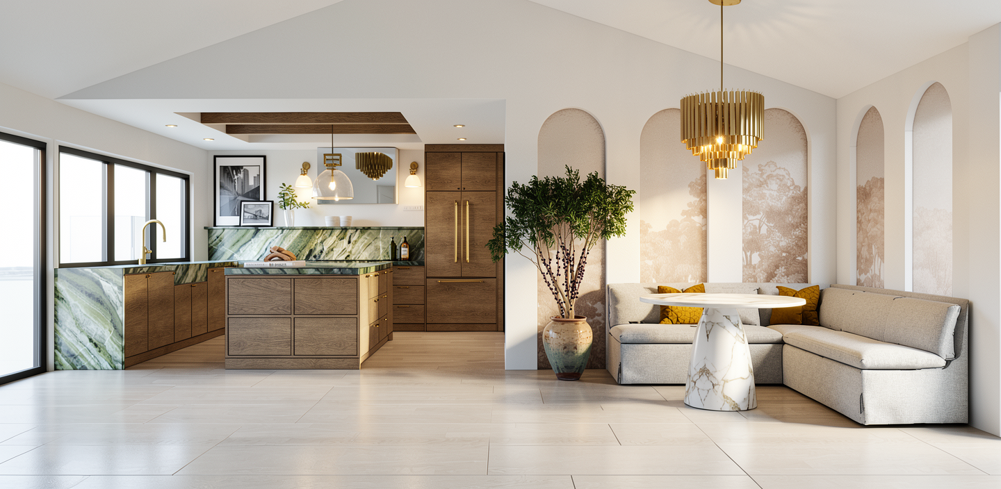 create a kitchen rendering based on these elevations plan and materials