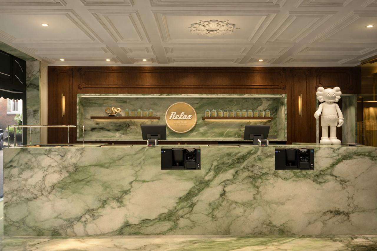 ultra realistic luxury hotel reception render based exactly on the uploaded image keep the same design layout proportions camera angle materials and composition do not redesign anything the reception desk and back wall are clad in green white dramatic marble with bold veining polished but elegant with realistic depth and natural stone variation keep the dark rich walnut wood wall paneling behind the desk with premium grain warm tone and soft satin finish preserve the white classic coffered ceiling with refined mouldings and recessed spotlights maintain the backlit circular relax sign the floating shelves with decorative perfume display bottles the reception monitors and the white sculpture on the right exactly in place enhance the scene into a high end photorealistic hospitality interior with balanced warm ambient lighting realistic indirect led glow soft shadows accurate reflections on polished marble refined contrast and premium hotel atmosphere make the marble look natural and luxurious not flat or artificial improve material realism sharpness and lighting quality only keep the space clean elegant and realistic do not change the design furniture placement wall detailing ceiling design desk shape sculpture or decorative composition negative prompt redesign change layout change marble color remove sculpture remove sign move objects add furniture add people overexposed lighting fake marble texture blurry render low detail distorted proportions modern minimal redesign different camera angle extra accessories different wood color altered ceiling pattern