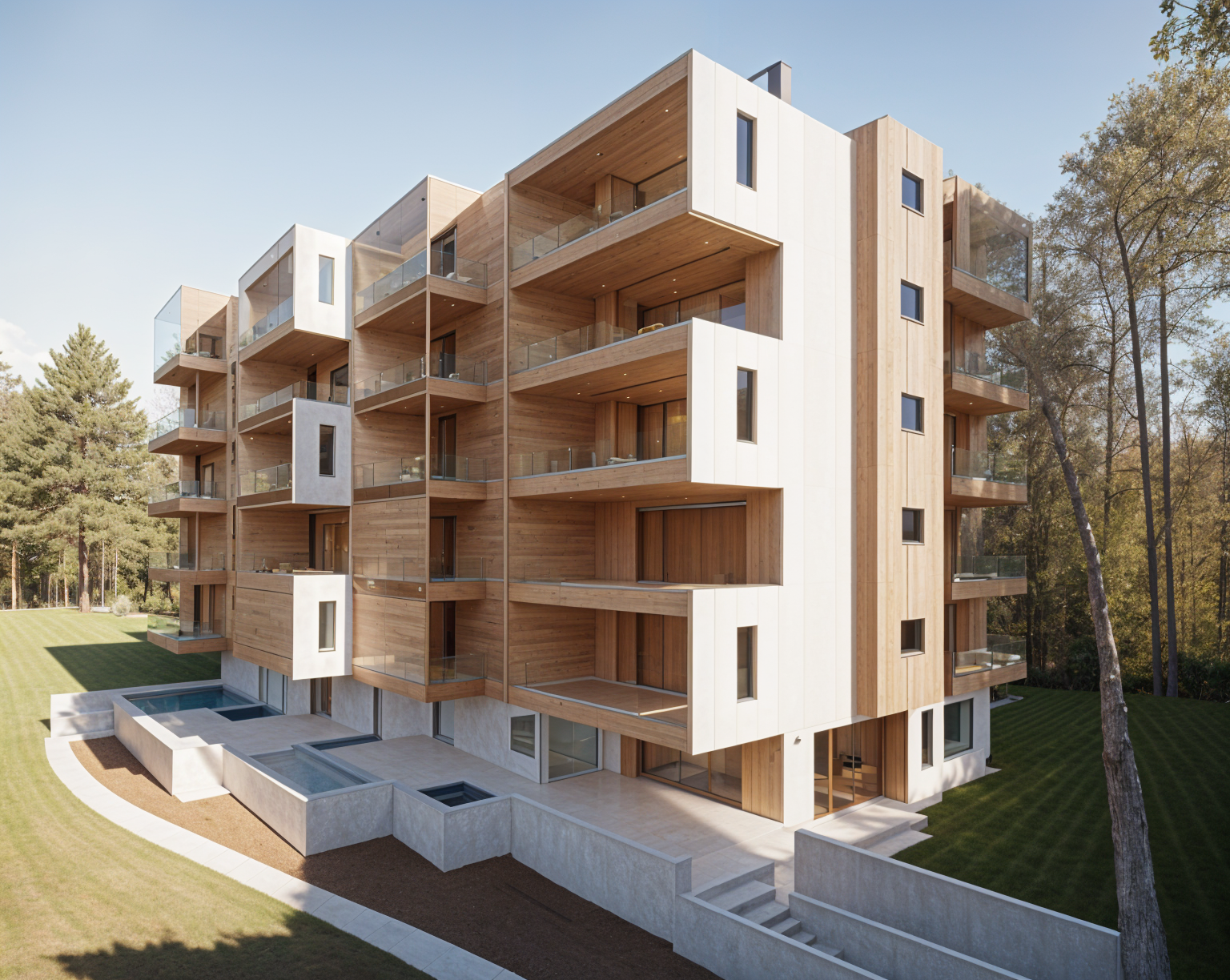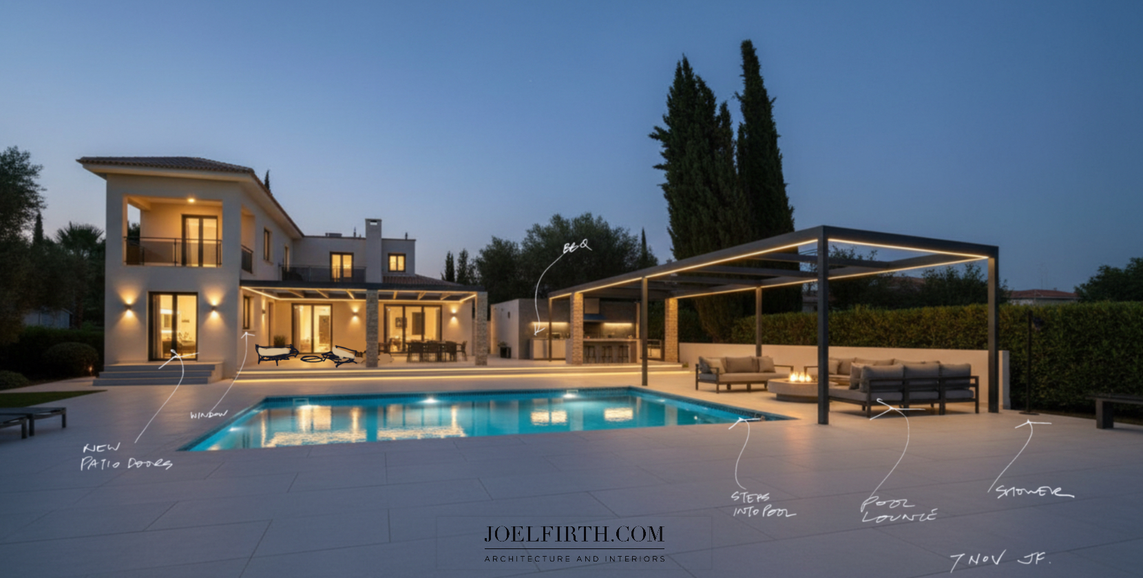 modern pool area with pergolas and led lighting large format tiles comfy sofas around pool outdoor kitchen to rear wall lights on in house and in pool external lounge on left patio under pergola