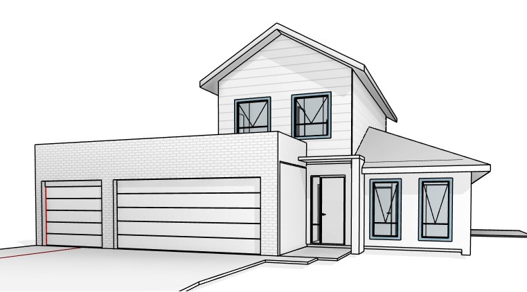 this house has a grey face brick double and single in the front ground floor is white rendered brick work and the first floor is white weather board the front door is a wooden door with a glass side panel the garage door are sectional garage doors