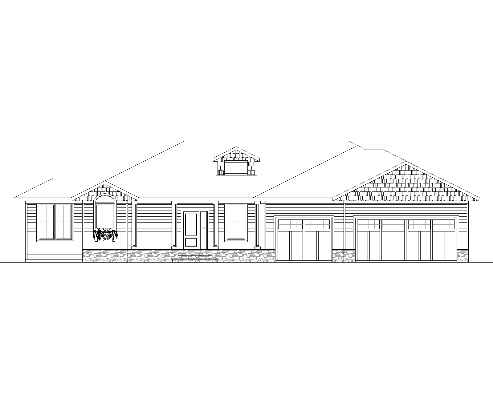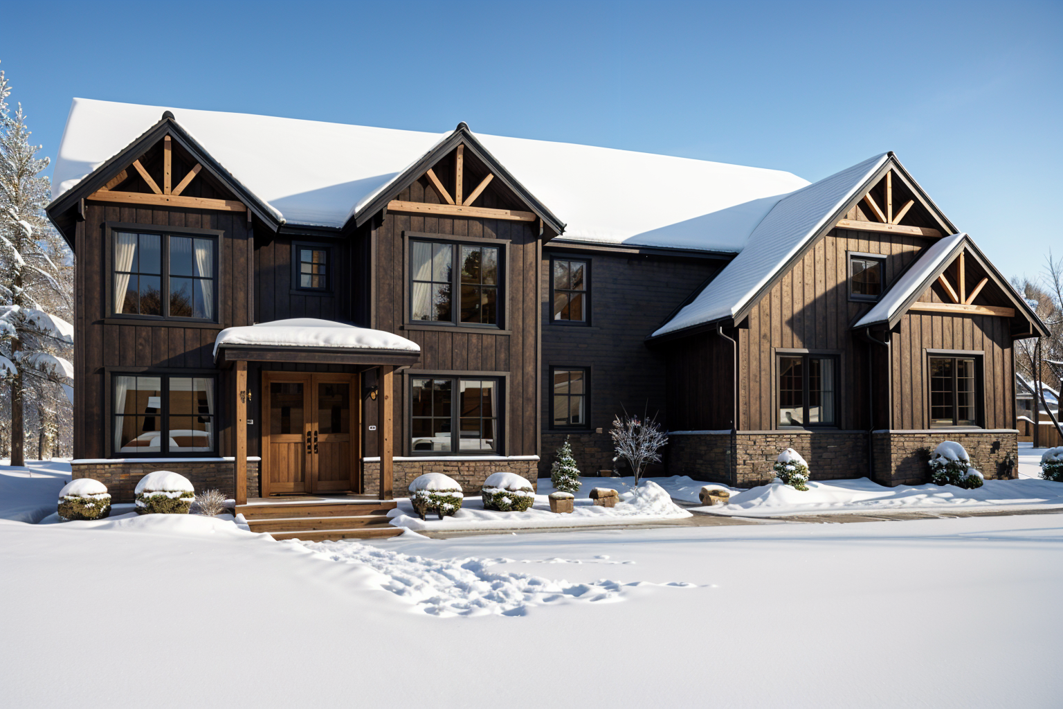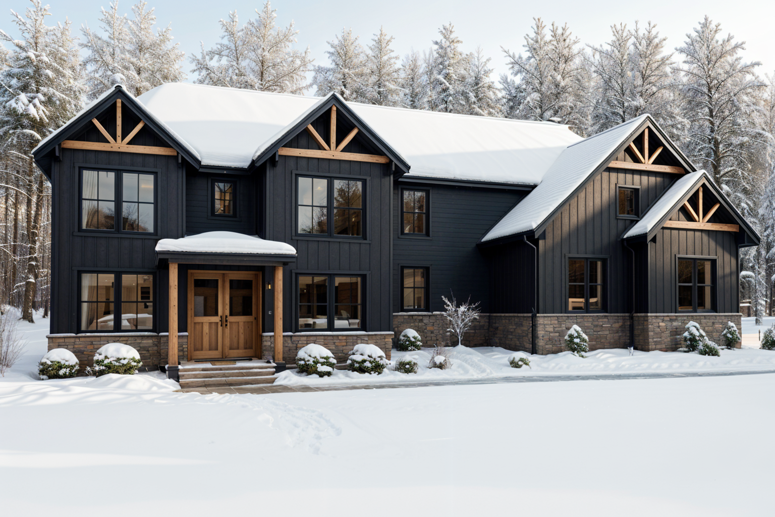 wooded area in the background nicely lanscaped dark green siding with black windows and shingles wood tone posts and garage doors add lake in background