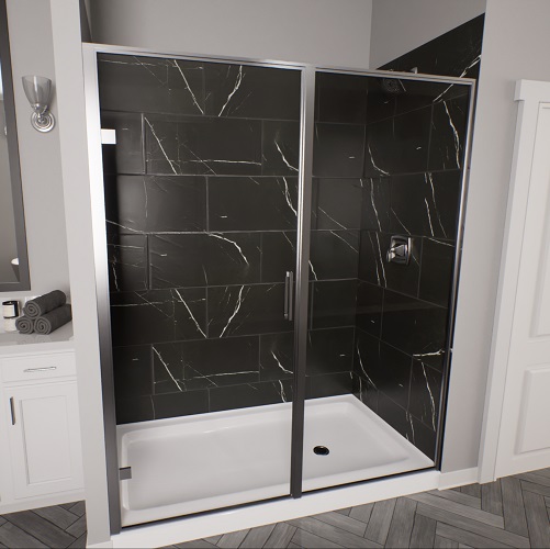 a high end hyper realistic professionally styled real estate photograph of a modern bathroom the scene features strong architectural symmetry and contrast the dominant elements are a large glass panel shower no water spots on the glass