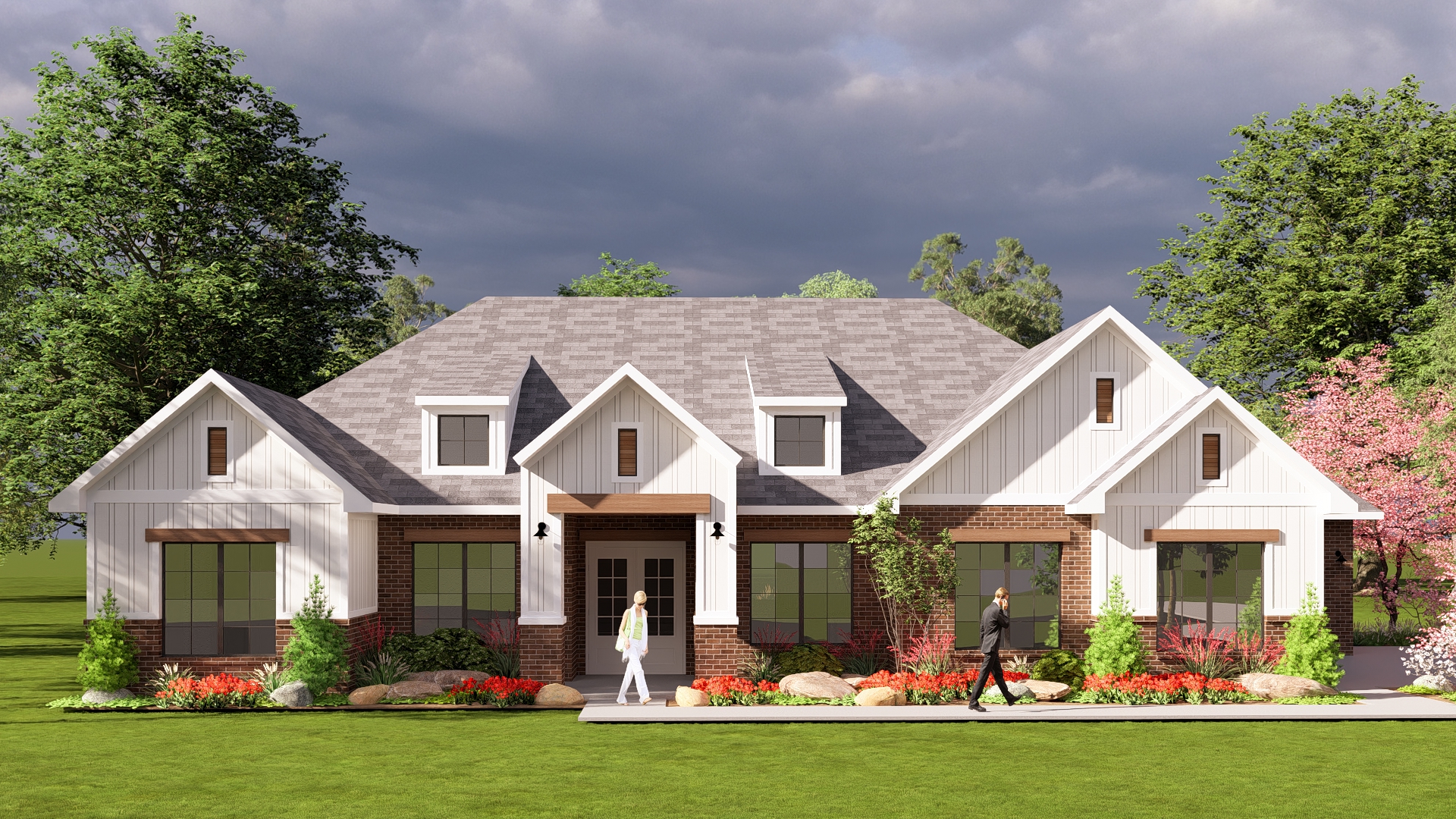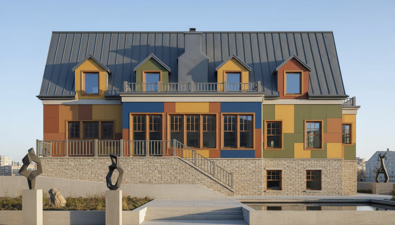 remove the rainy clouds and show thin scattered clouds keep the colors and materials as shown but make the roof a charcoal color and have the image look photo realistic