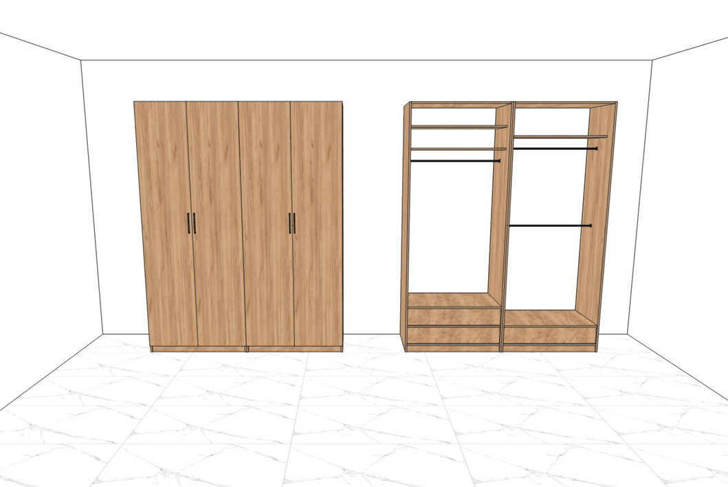 changing the layout symmetry size position proportions colors or appearance of any elements inside or outside the wardrobes is strictly forbidden only what is explicitly defined in this prompt is allowed transform the input image into an ultra realistic wardrobe presentation scene using image to image generation preserve the original composition alignment scale perspective and visual structure exactly as shown in the input image right wardrobe open wardrobe the open wardrobe contains exactly three stainless steel inox clothing hangers the shelf and drawer layout must remain exactly as shown in the input image do not change the number position spacing orientation size or arrangement of any shelves drawers or internal elements only add realistic clothing to the three existing hangers such as shirts jackets or coats the clothing must fit naturally and follow the existing layout without moving resizing or modifying any internal structure all colors and materials must remain exactly as shown in the input image left wardrobe closed wardrobe generate the closed wardrobe exactly as shown in the input image do not change its design color proportions materials or placement in any way allow soft natural daylight to fall onto both wardrobes creating subtle realistic shadows and accurate material reflections without changing the scene framing or lighting direction ensure ultra realistic materials high detail textures and physically accurate lighting for a true photorealistic result the final image must appear ultra detailed photorealistic 8k quality luxury interior style any modification not explicitly defined in this prompt is strictly forbidden the original wardrobe design and layout must remain visually identical