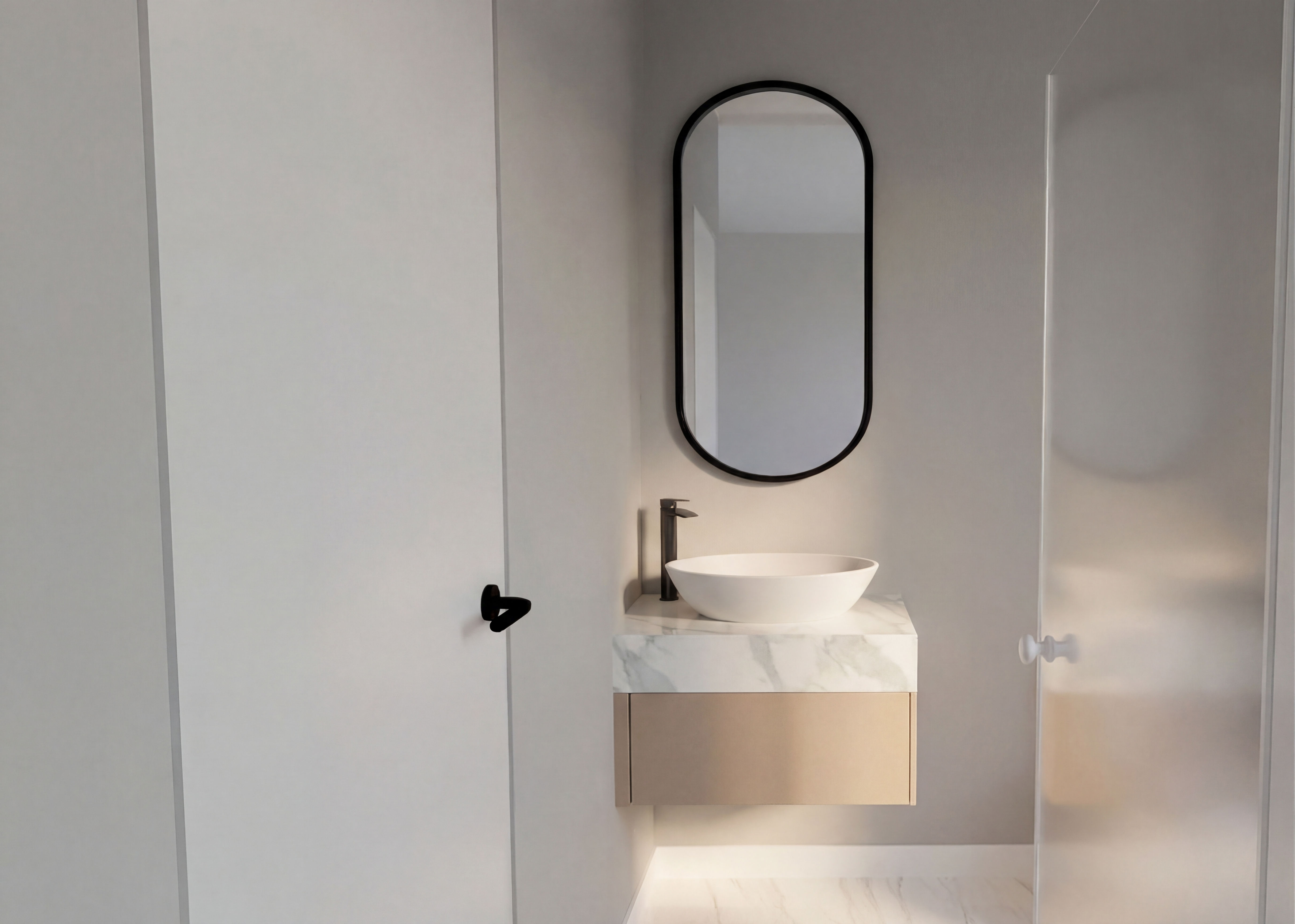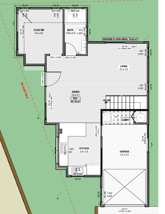 create an architectural floor plan rendering of a modern single story house use a combination of soft pastel colors and natural tones for an inviting atmosphere the main living spaces including the living room and dining area should have warm beige and light taupe wooden flooring the kitchen features sleek white cabinets with stainless steel appliances the cozy flex room is adorned with light grey walls to create a versatile feel the garage should have a concrete finish with subtle speckles for texture add lush green landscaping surrounding the house with a bright inviting lawn the atmosphere is serene and modern emphasizing a streamlined and elegant design
