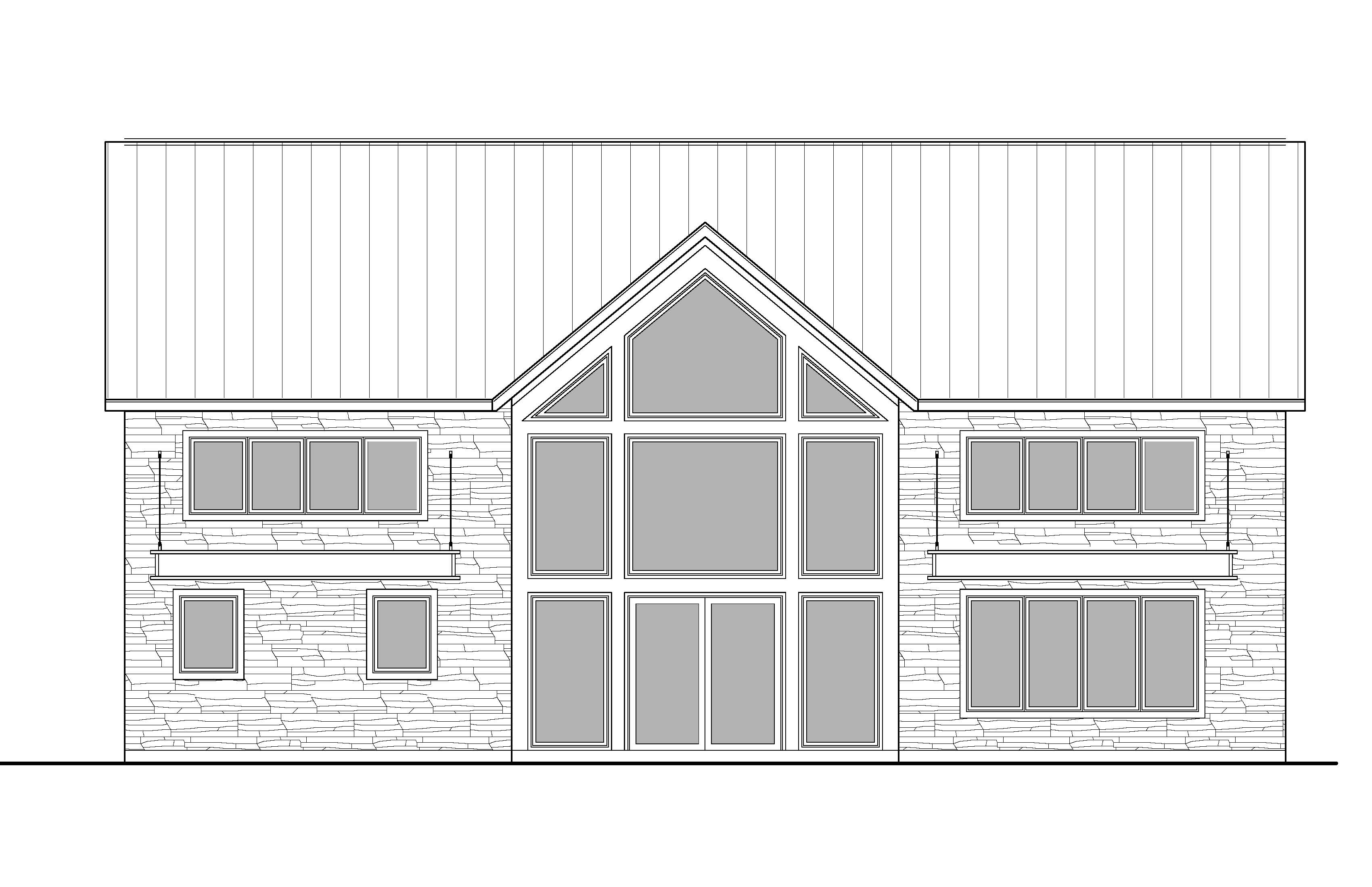 create an exterior perspective rendering of this house with darker grey siding with black trim and windows along with the canopy above the windows and a black metal roof in a rustic wooded setting
