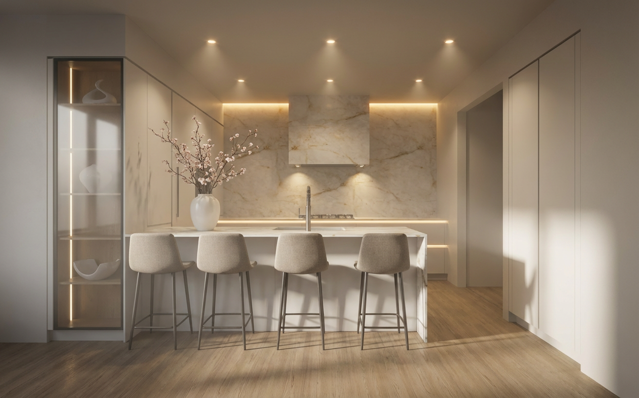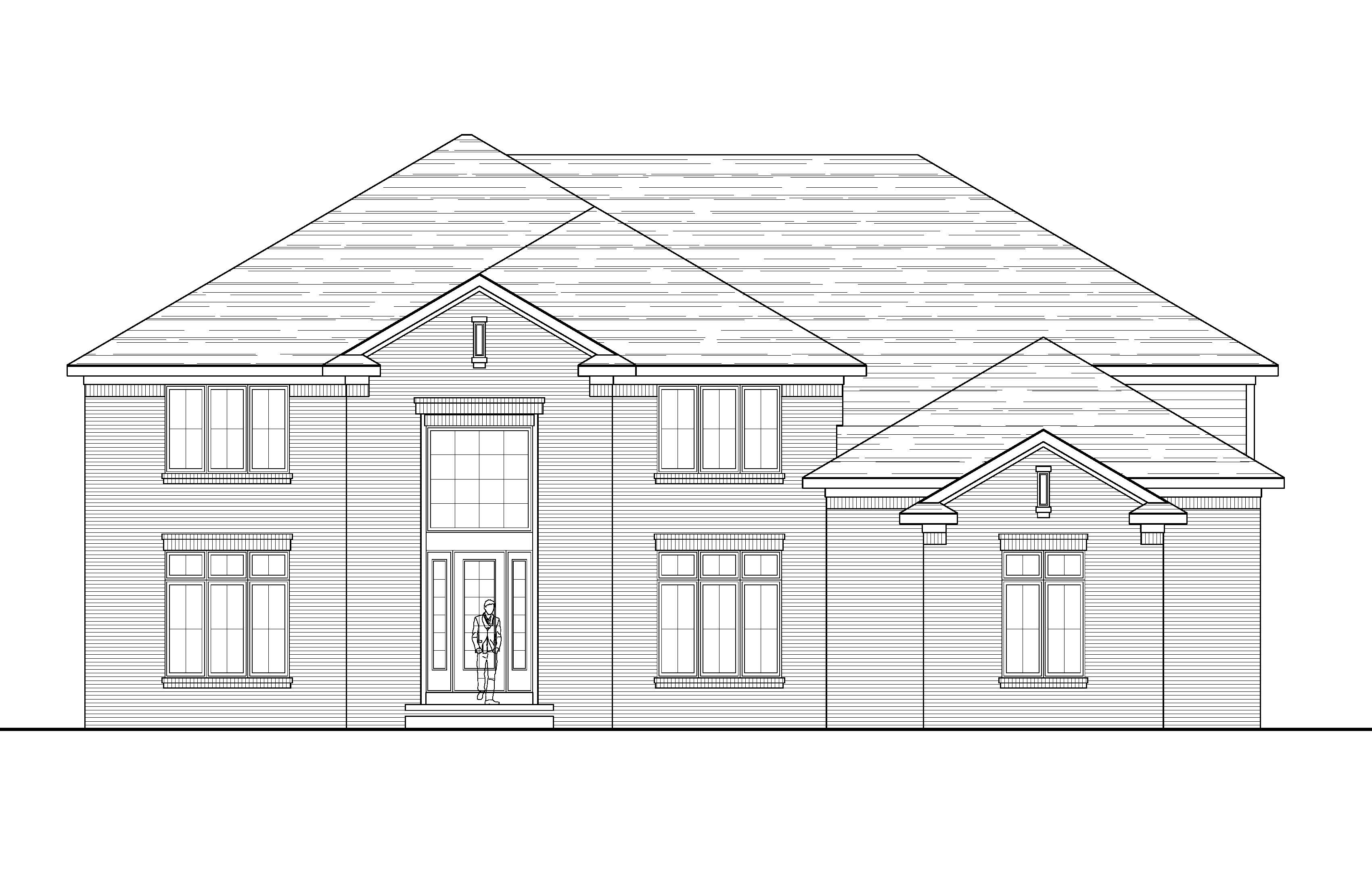 6pm evening a modern two story house with a sleek design and hip roofs featuring mostly brick with some neutral siding with darker trim the roof is a dark charcoal color adding contrast large windows dominate the facade reflecting the clear blue sky the front and garage doors are very dark stained wood surrounding the house a lush green lawn with colorful flower beds in shades of pink lavender and yellow lansdcape stones dot the yard framing plantings the atmosphere is serene and welcoming with evening sunlight casting gentle shadows do not modify the massing as shown