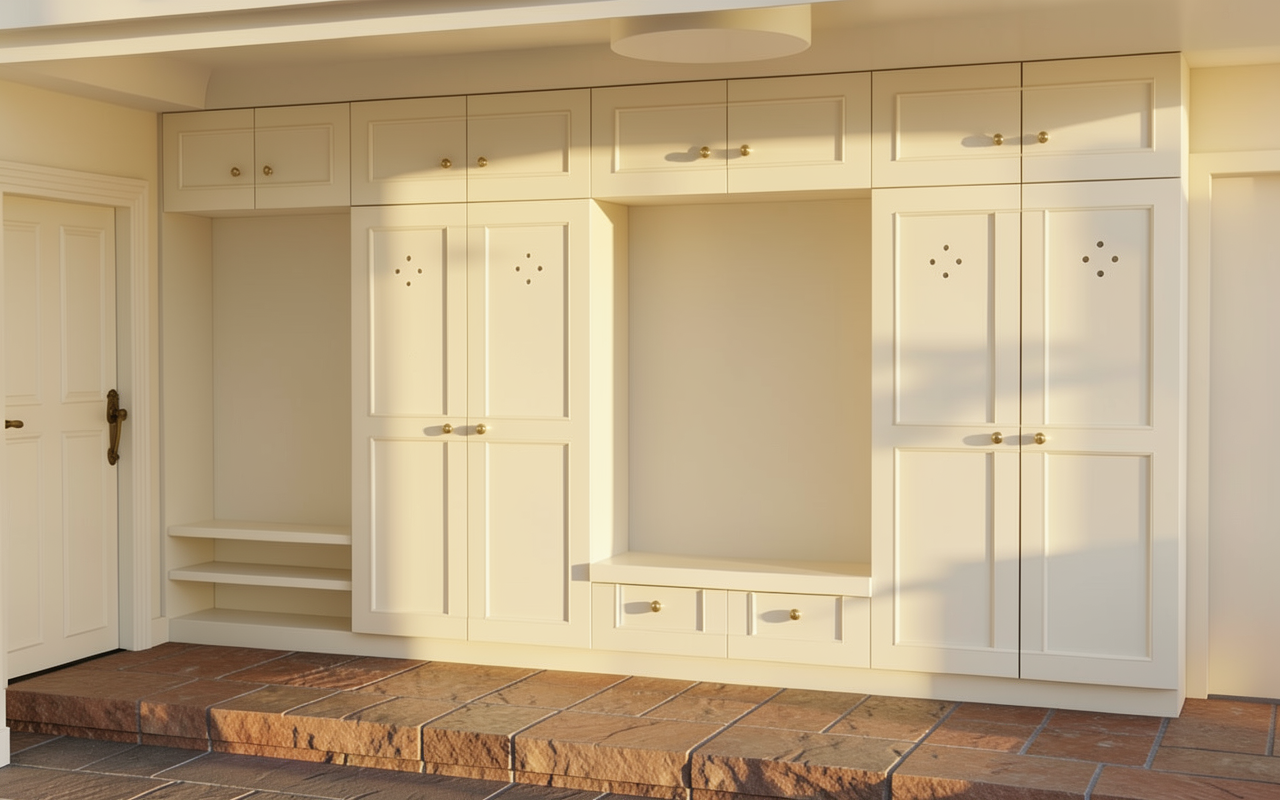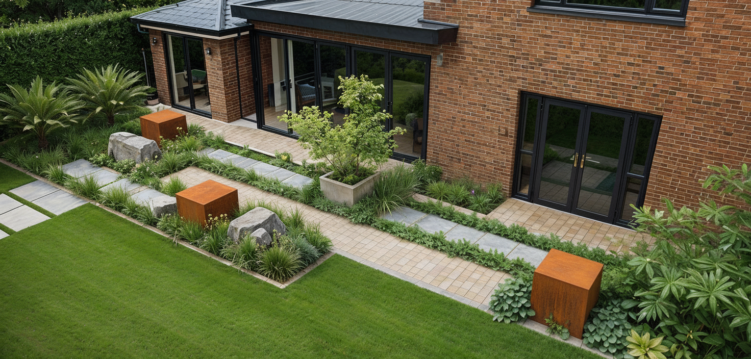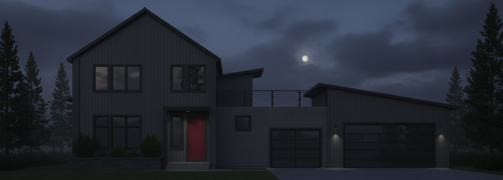 turn this image into a night time photo in the dark use subtle uplighting set in the planting next to the three cubes and the small tree in planter one wall light on the house between the patio doors and main door one wall light on the garage wall