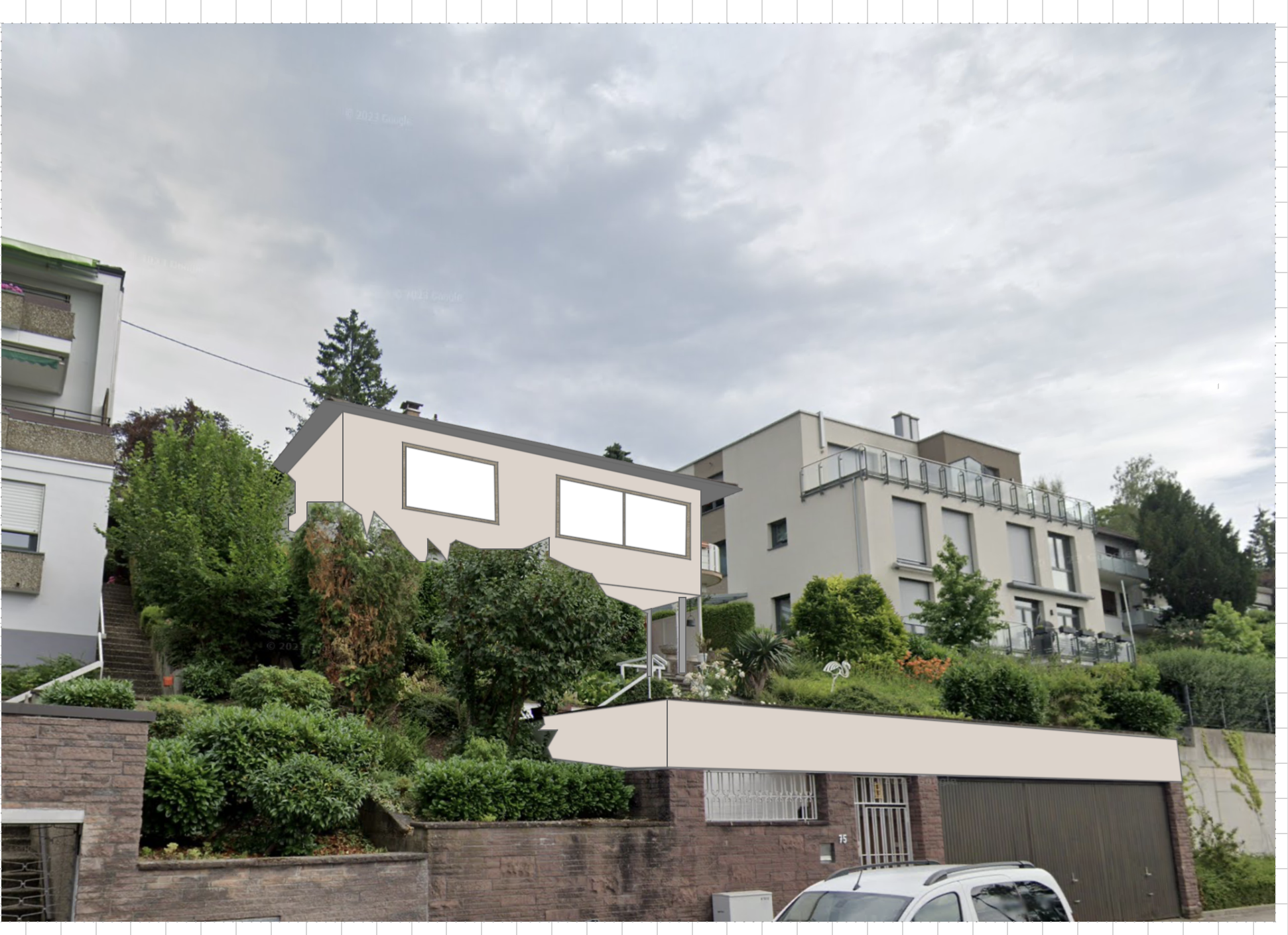 charge th middle house ito a realistic rendering keep all the geometric the facade should be cream light brown the window frames are oak wood make it fit i the setting