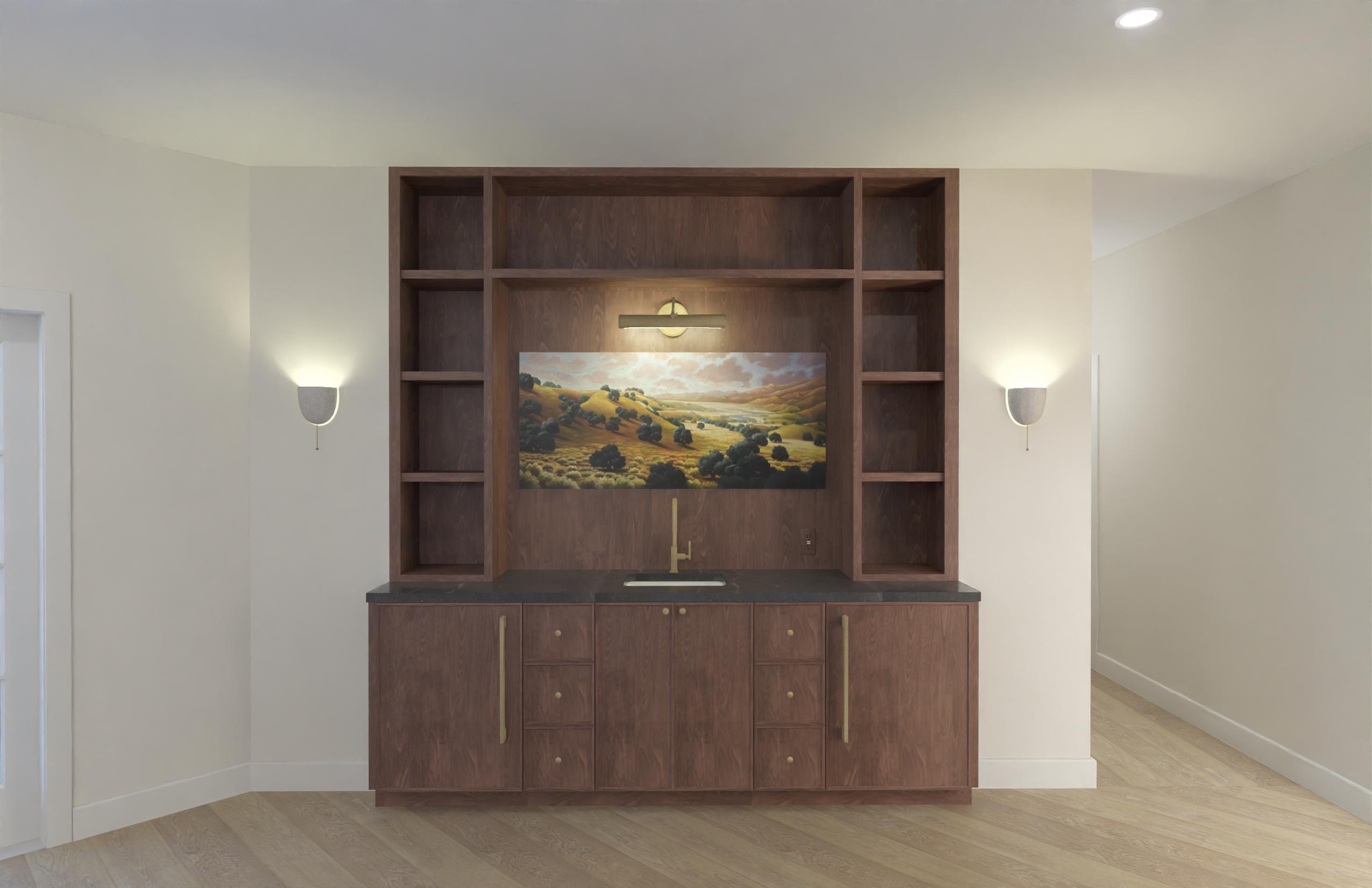 bring life to this rendering with elegant details that fit the feeling of a moody library like bar keep the white wall on the right the same keep the flooring light white oak