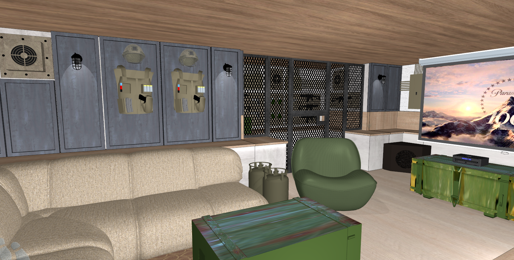 create a moody basement cinema with soft sensual lighting this has a military feeling